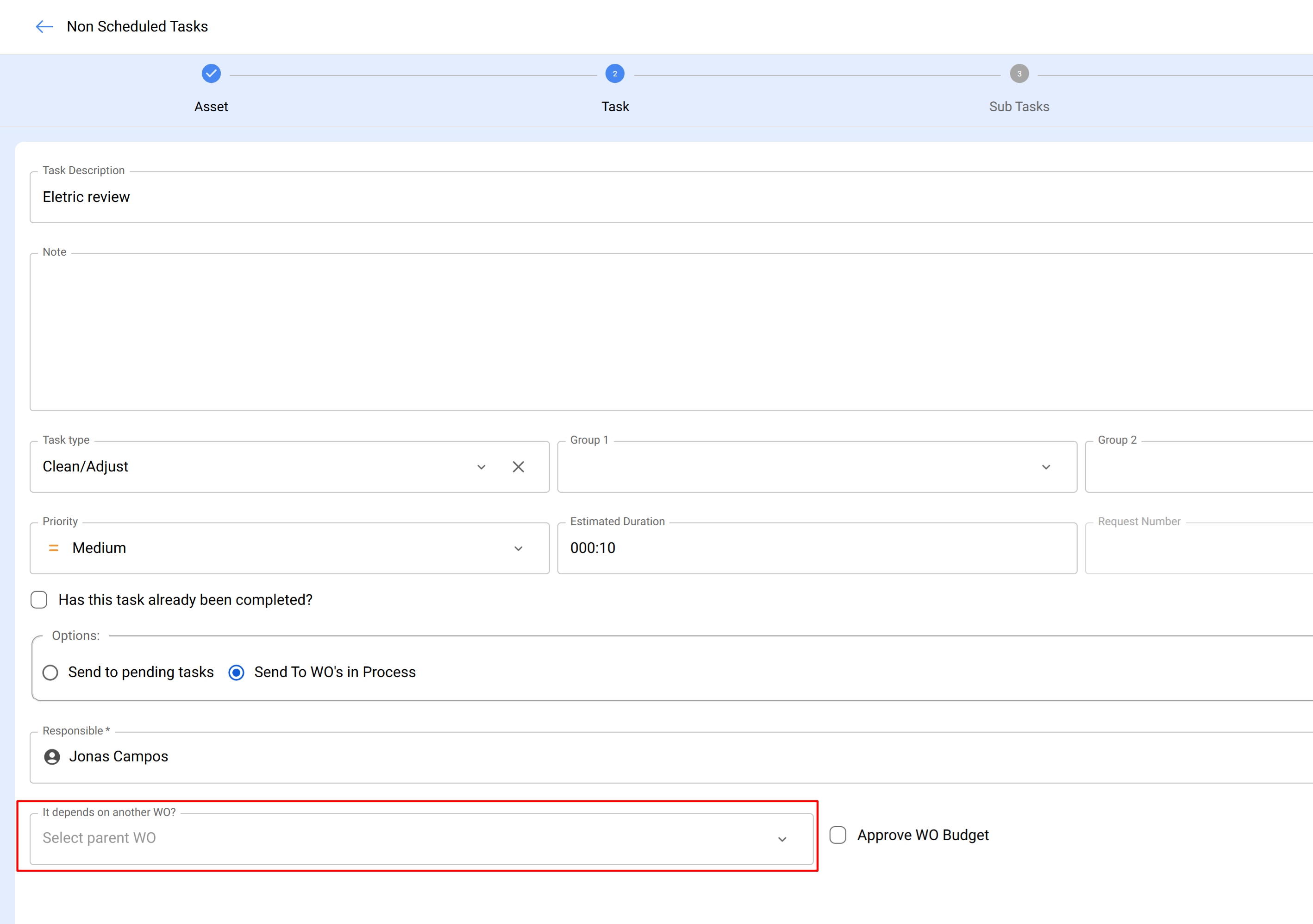 Lors de la création d’un Ordre de Travail, les utilisateurs peuvent configurer des dépendances, en spécifiant un "OT parent" dans le champ "Dépend de". Cette pratique établit une exigence d’exécution séquentielle des tâches.