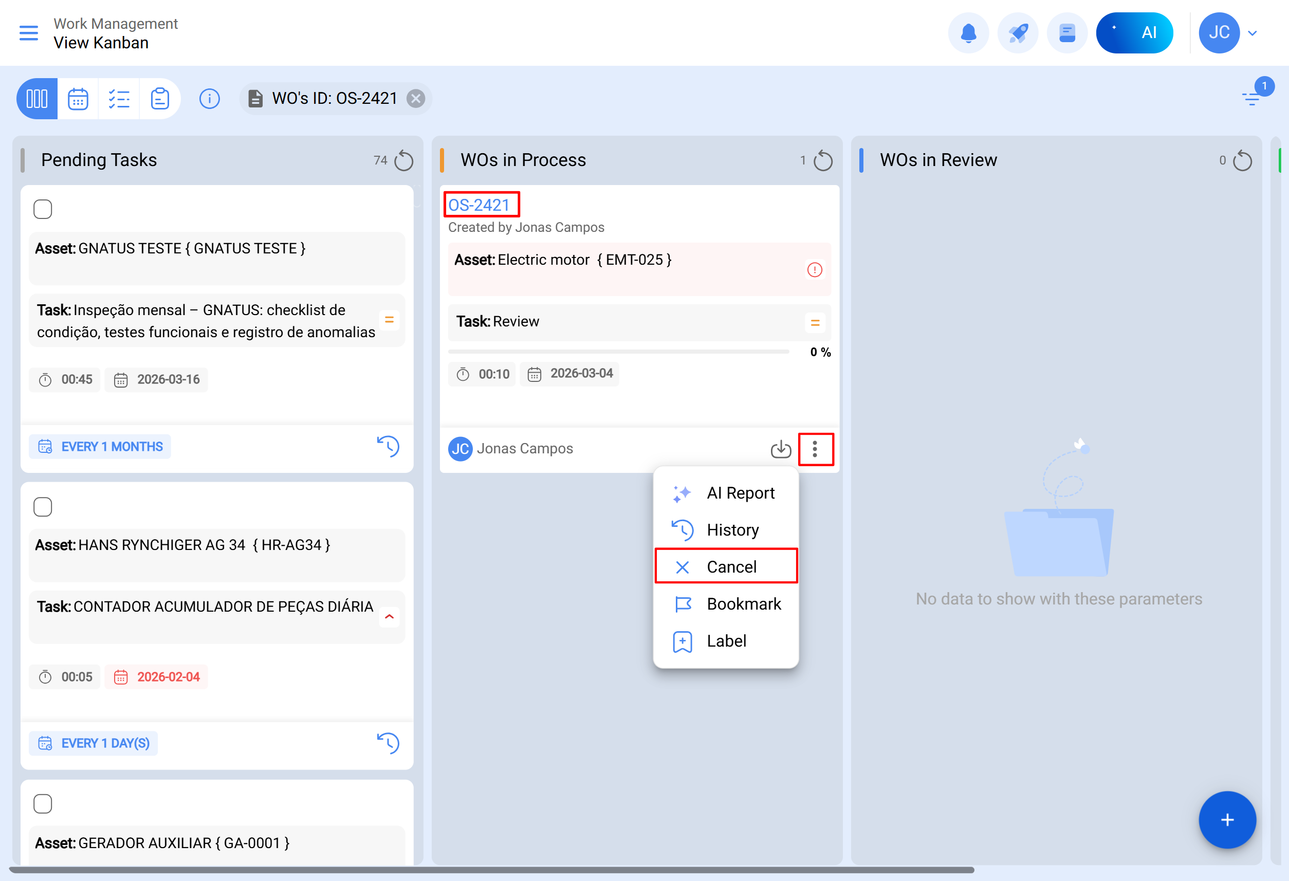 En cliquant sur l’option OT Parent directement depuis la carte de l’OT dans le Kanban, le système vous redirigera automatiquement vers l’OT Parent.