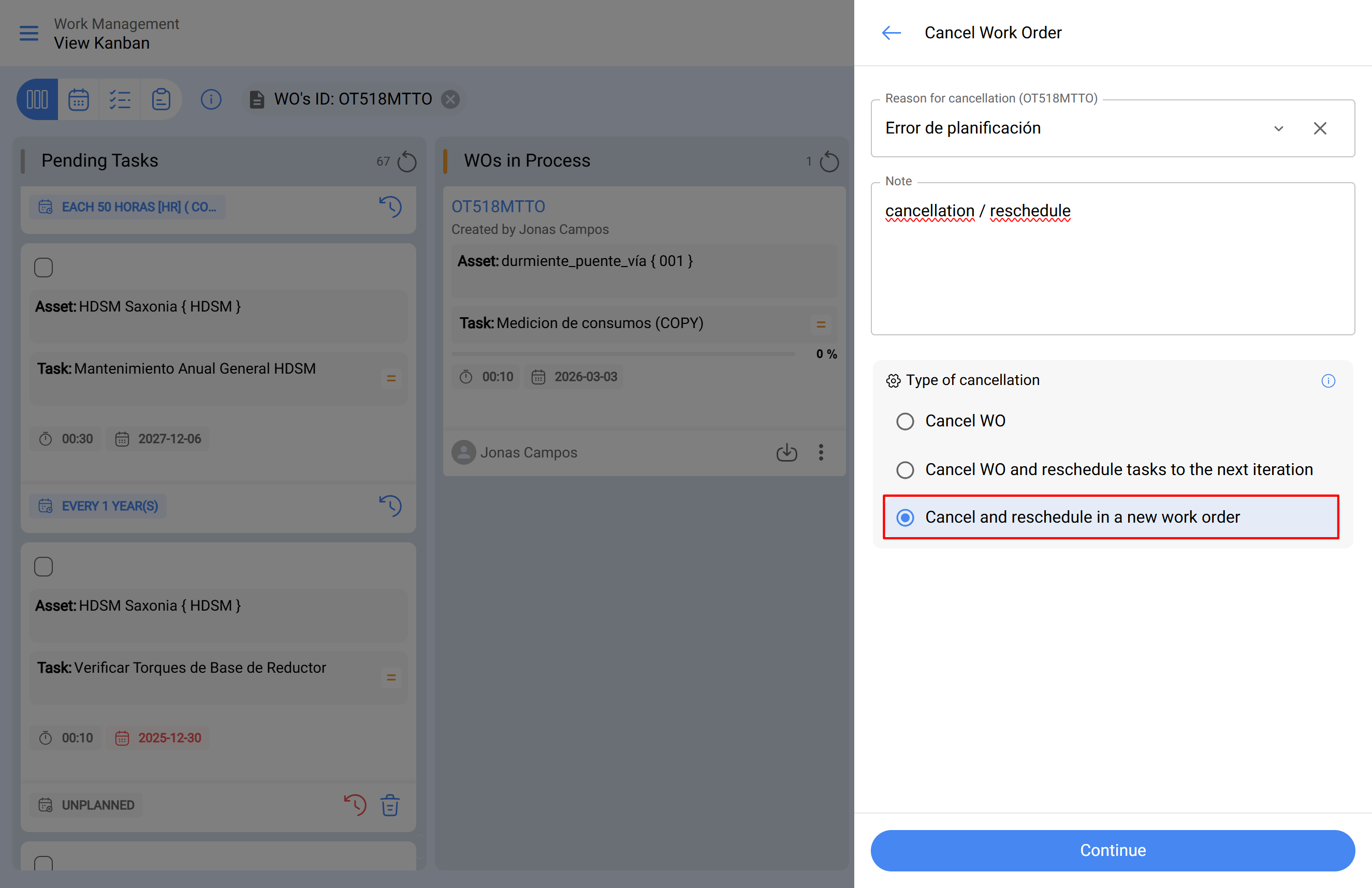Lorsqu’un OT en état "En Cours" doit être annulé et reprogrammé, cela permet de maintenir la traçabilité entre les deux.
