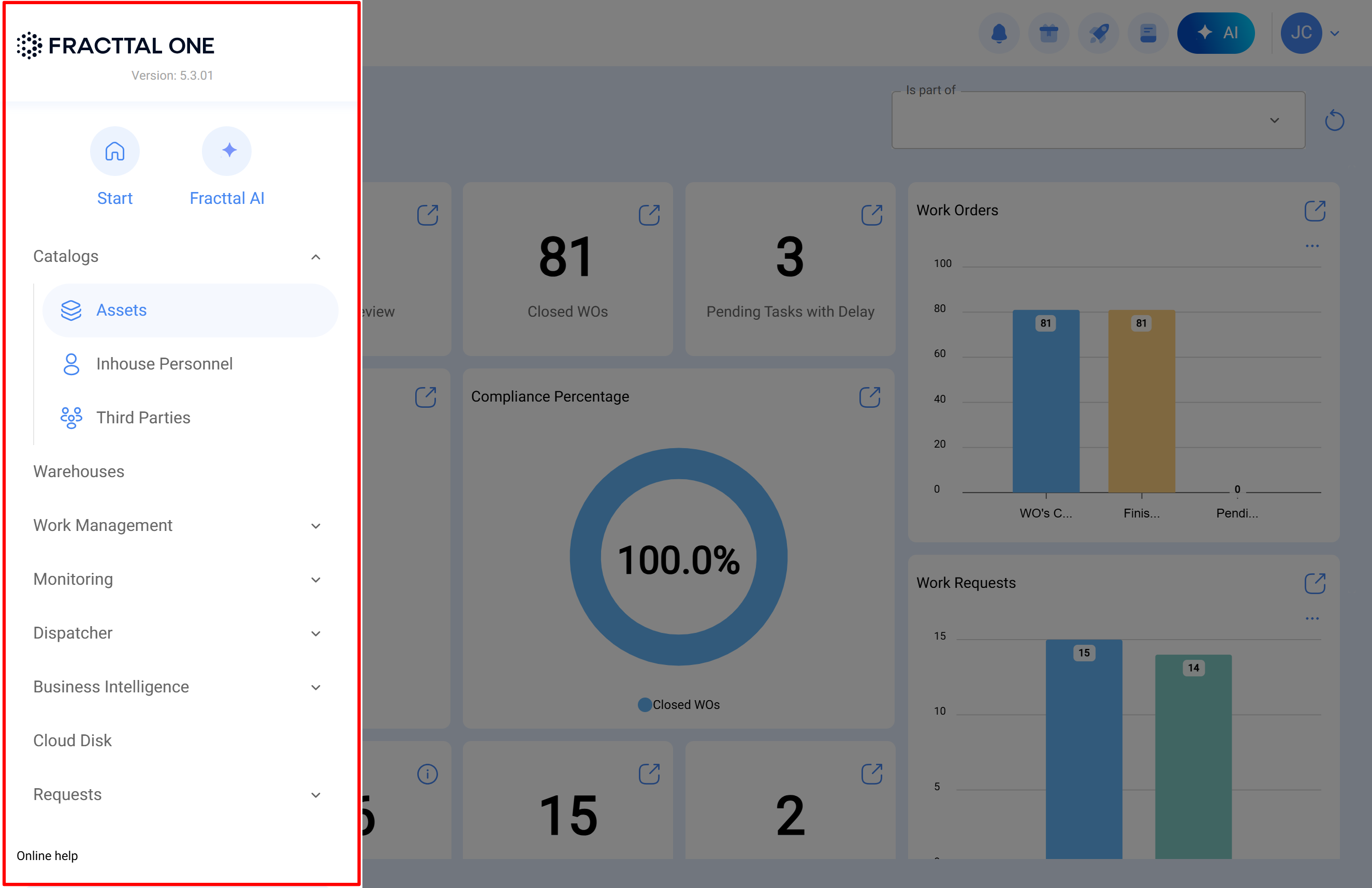 - Ajuda e Suporte Técnico: Menu com links para o nosso canal de suporte, manual de ajuda on-line, canal de sugestões, Fracttal Academy e a opção para dar acesso ao suporte.