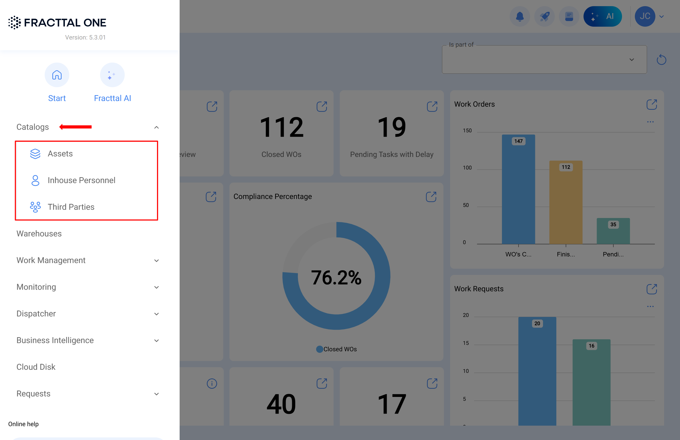 Ao clicar, o sistema exibirá uma janela com todos os módulos, lá você deve clicar novamente em "Catálogos" para que o conteúdo (Ativos, Recursos Humanos e Terceiros) seja finalmente exibido.