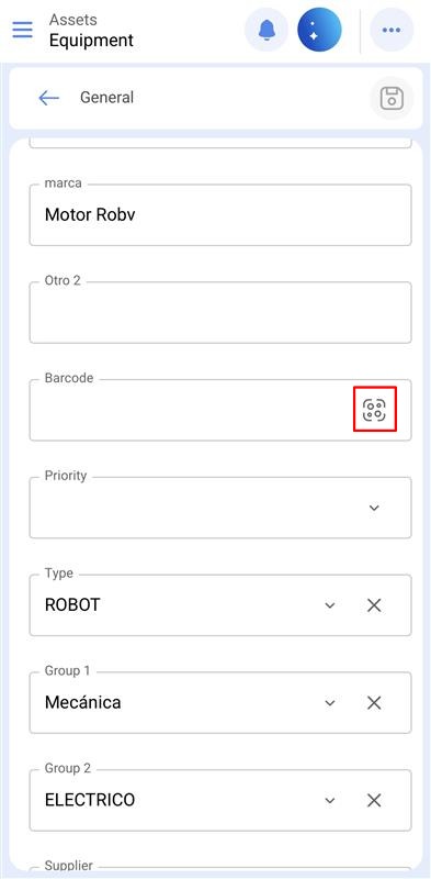 Abra o ativo que você deseja gravar na tag disponível, selecione a opção Geral e clique no botão “Código de barras / NFC”.