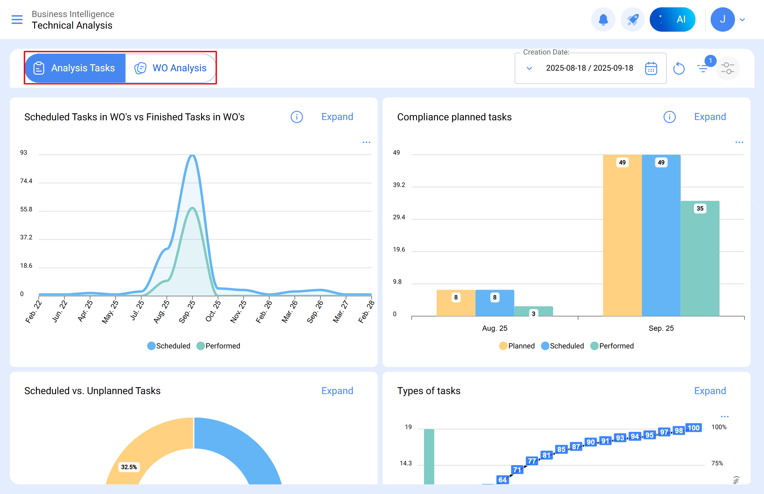 A Análise de Tarefas apresenta gráficos para avaliar como as tarefas programadas e realizadas são cumpridas, comparar as tarefas planejadas com as não planejadas, classificar os tipos e revisar os reagendamentos e pausas dentro das ordens de serviço. Além disso, a análise de Ordens de Serviço oferece visualizações que, através de uma análise detalhada, ajudam a compreender a evolução na criação e fechamento de ordens, os motivos de cancelamento e a qualidade do serviço, facilitando assim a tomada de decisões informadas a médio e longo prazo.