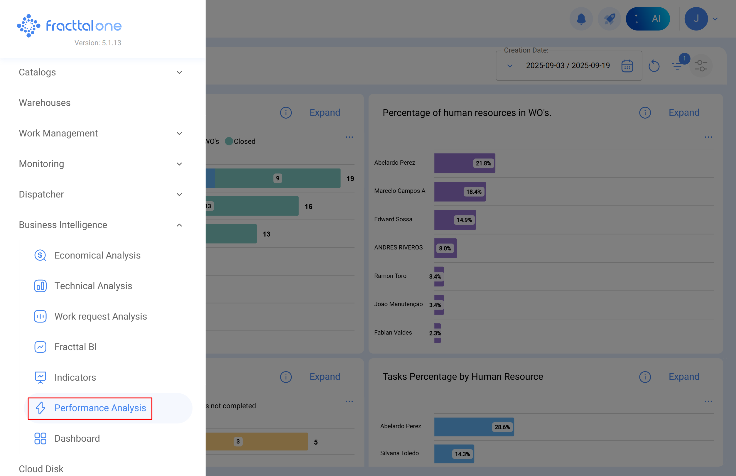 Este módulo permite analisar e visualizar dados-chave de manutenção para otimizar recursos, melhorar a eficiência e acompanhar KPIs. Com dashboards intuitivos, relatórios detalhados e análises avançadas, o Fracttal BI facilita a gestão estratégica da manutenção.