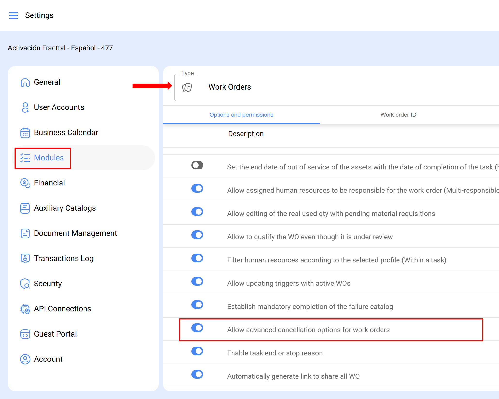 Para ativar as opções avançadas de cancelamento de OSs: