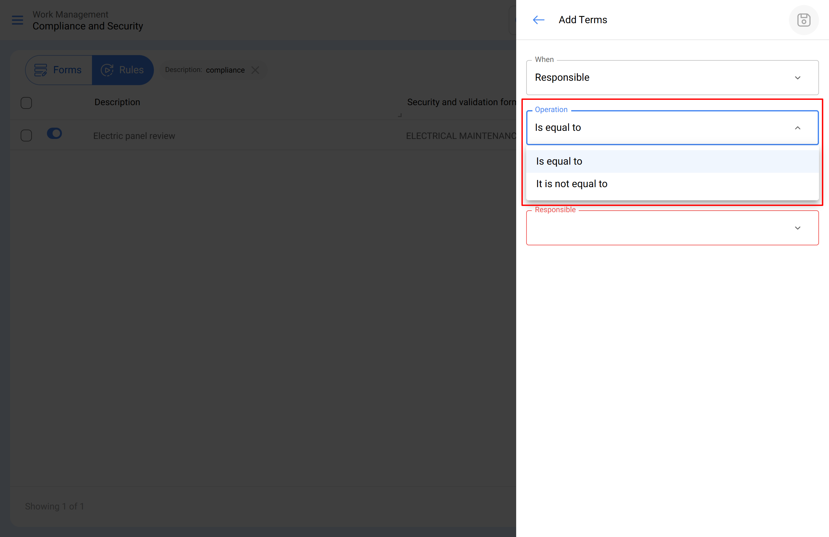 A operação define como o valor selecionado será avaliado em relação aos dados existentes na Ordem de Serviço (OS), podendo incluir opções como: