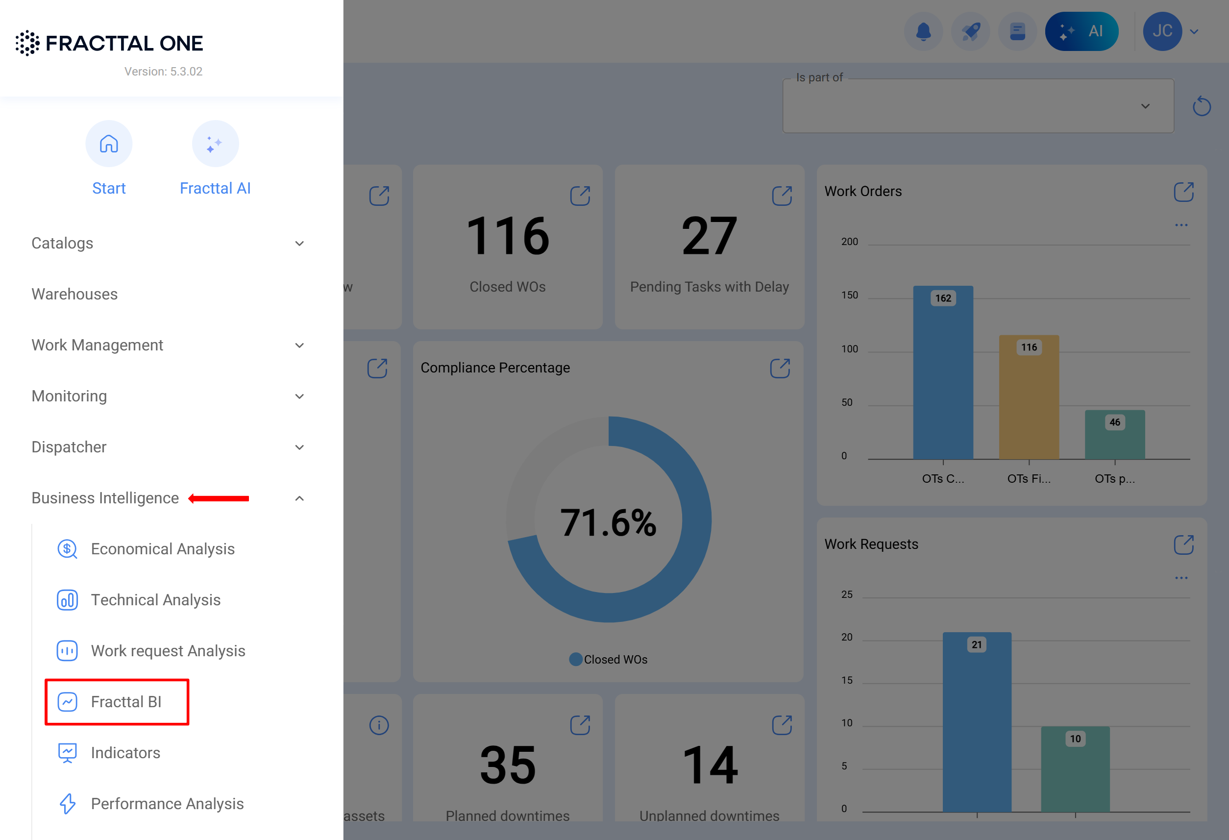 No menu principal do Fracttal One, vá para Inteligência de Negócios > Fracttal BI.