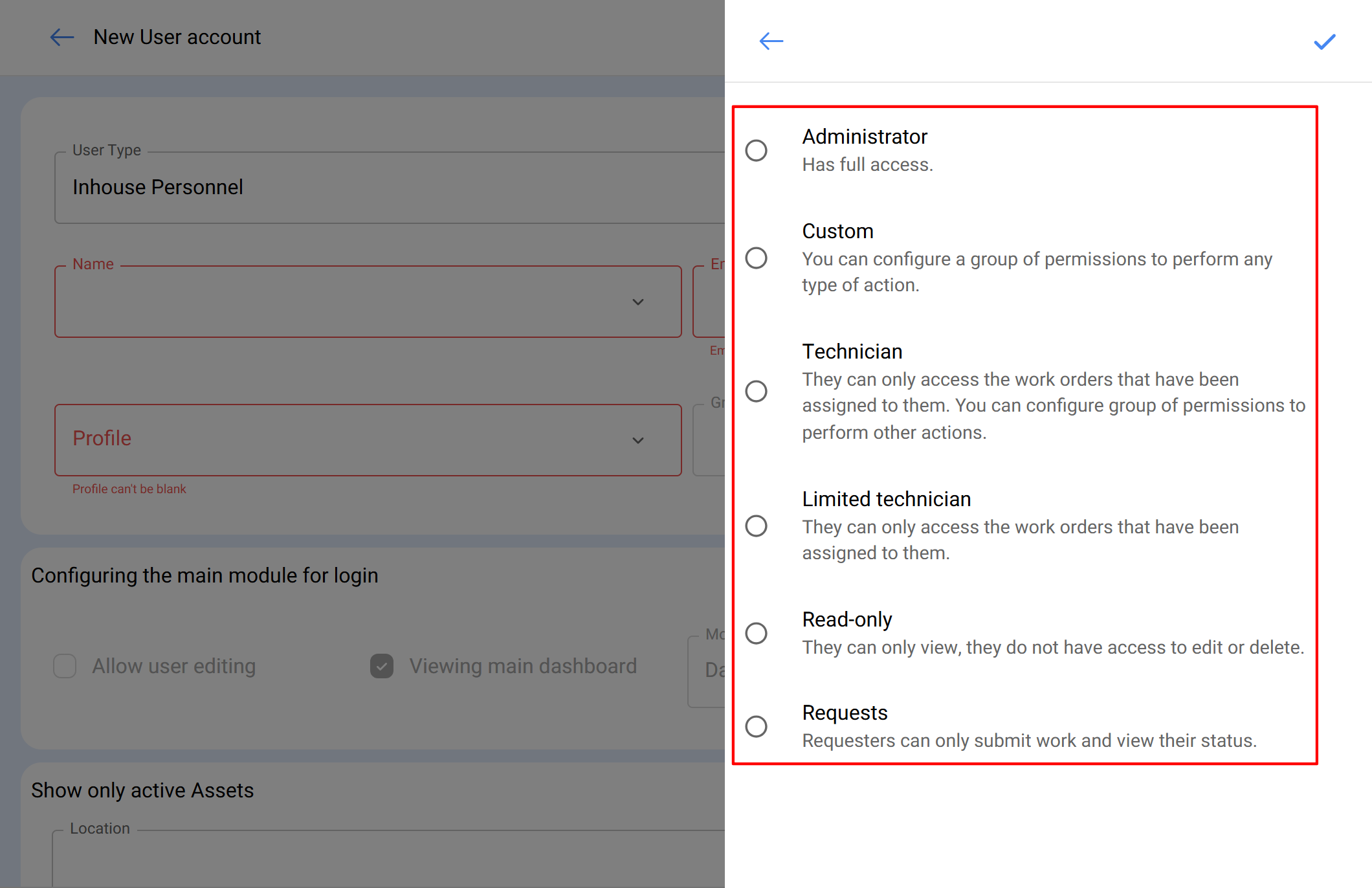 Perfil Técnico Limitado: Este perfil está pensado para empresas com um grande número de técnicos que apenas precisam completar as suas próprias OTs. Devido a isso, o perfil só permite completar ordens de trabalho e gerar solicitações de trabalho, e não requer configurações adicionais de permissões, pois as traz por defeito.