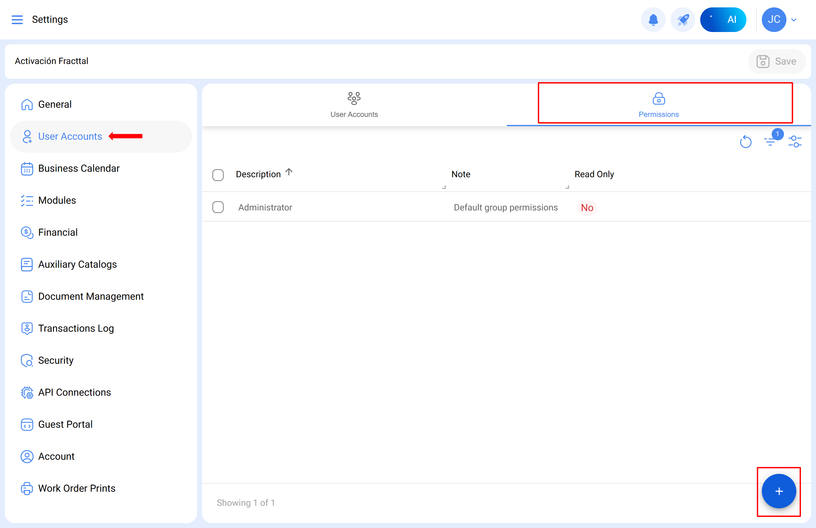 Para adicionar grupos de permissões no Fracttal One, primeiro é necessário aceder ao separador “Permissões” e posteriormente clicar na opção de adicionar, localizada no canto inferior direito da janela.
