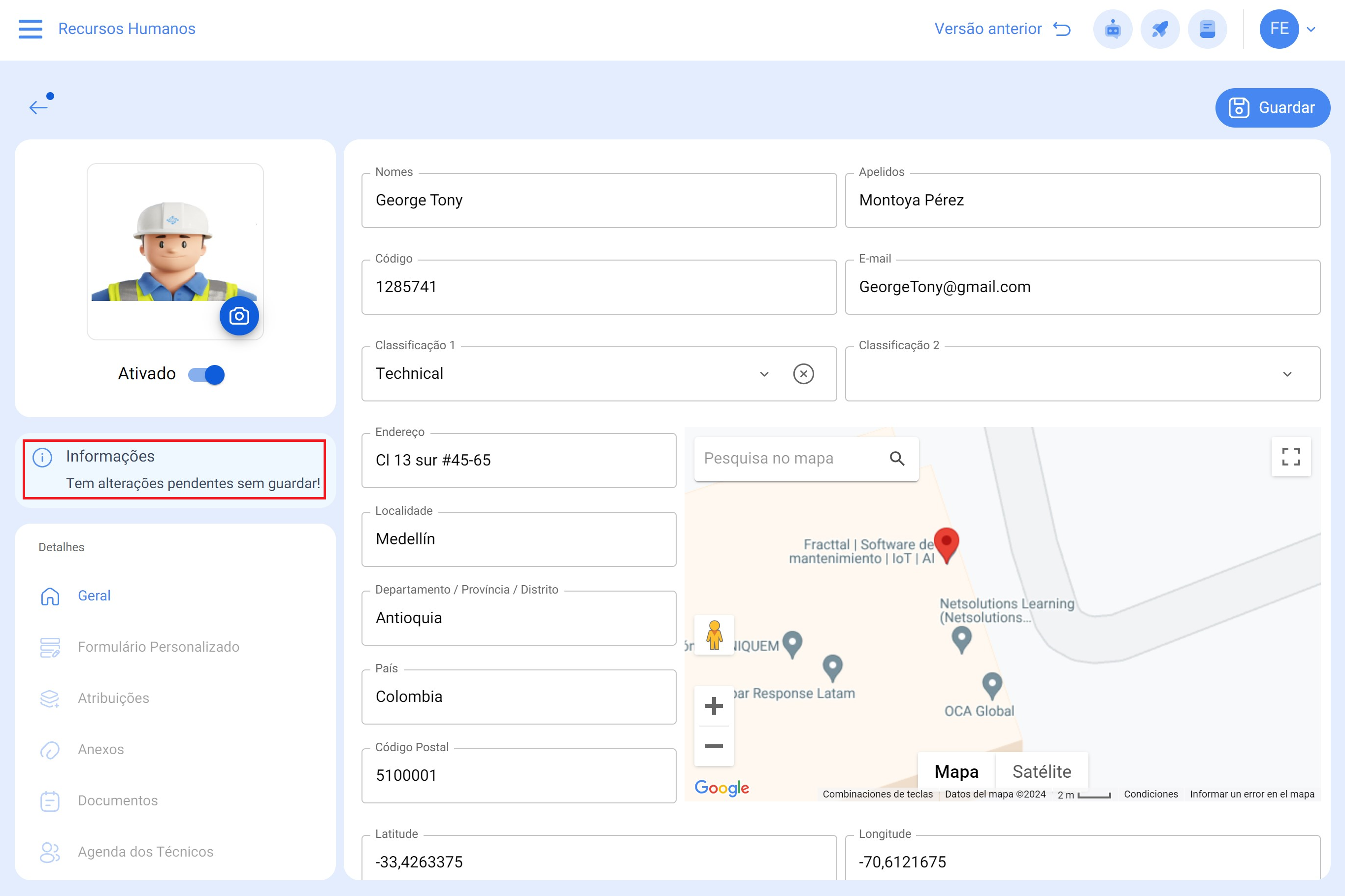 Latitude, Longitude: Campos que são automaticamente adicionados quando se "Pesquisa do Mapa" para o endereço ao qual o recurso humano pertence.