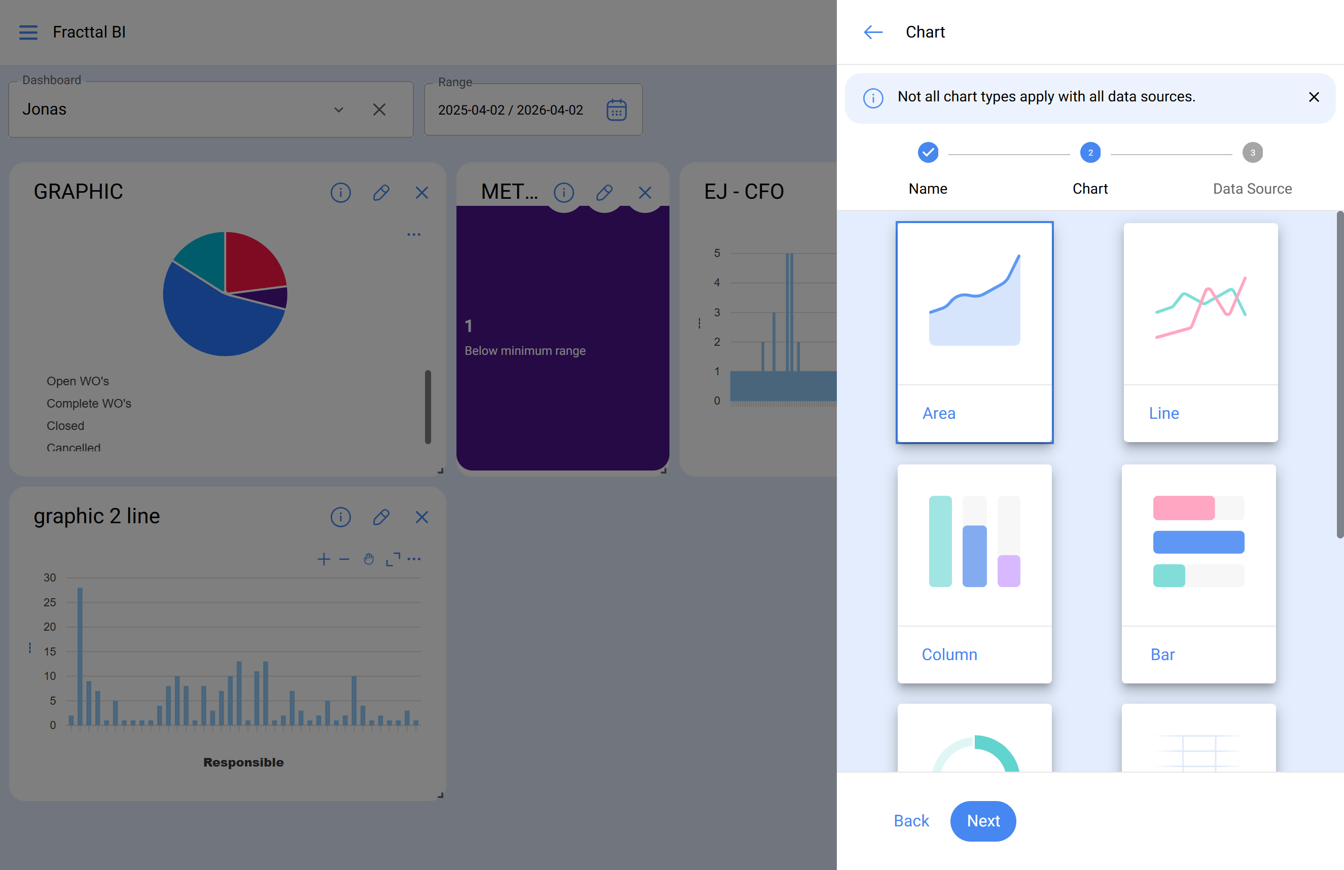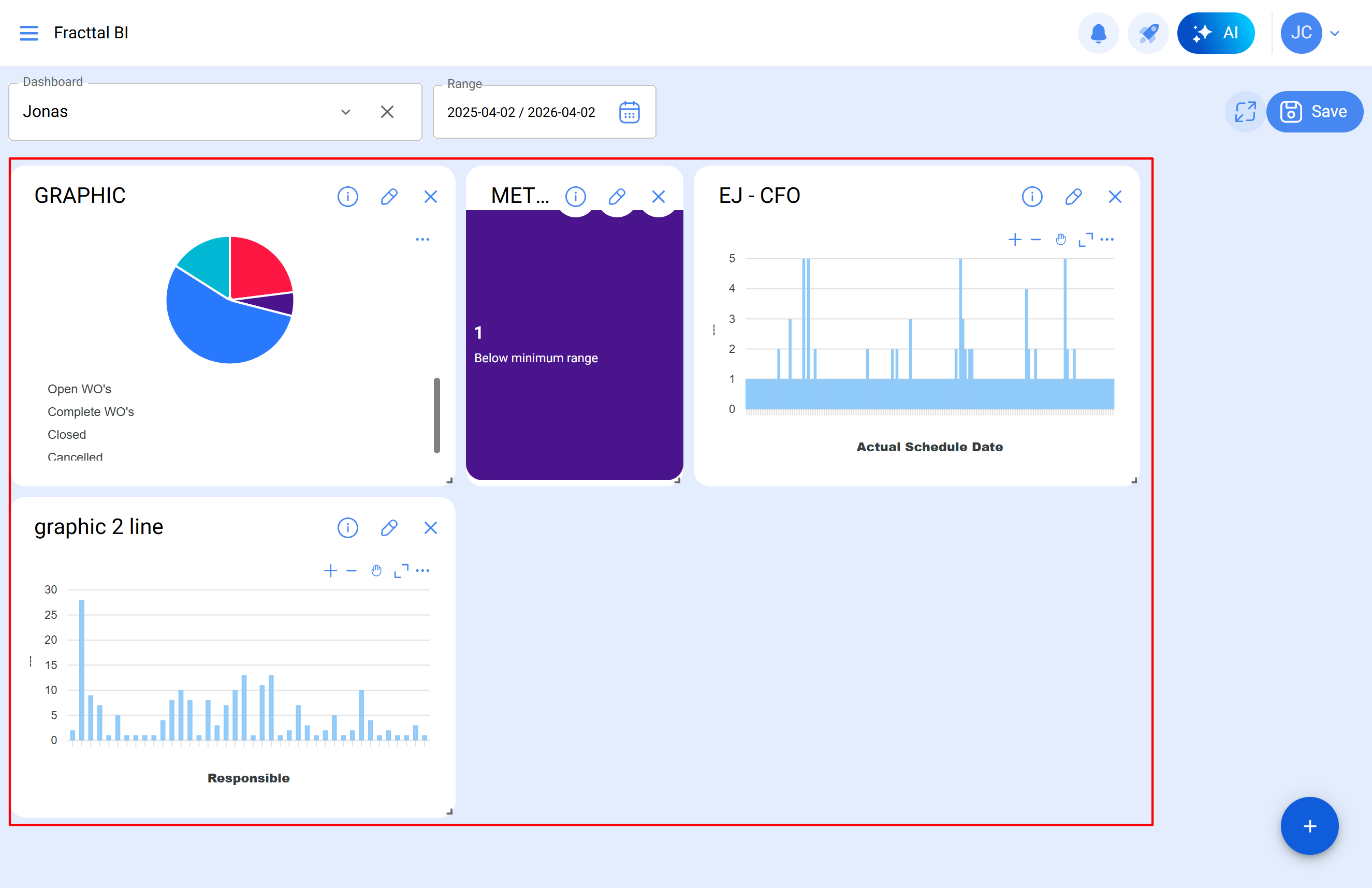 Os widgets são os diferentes gráficos ou tabelas que podem ser adicionados nos painéis do módulo Fracttal BI. Com estes widgets, os utilizadores podem ver e analisar os dados de forma interativa e adaptada às suas necessidades, o que ajuda a compreender melhor a informação importante para a gestão e a tomada de decisões.