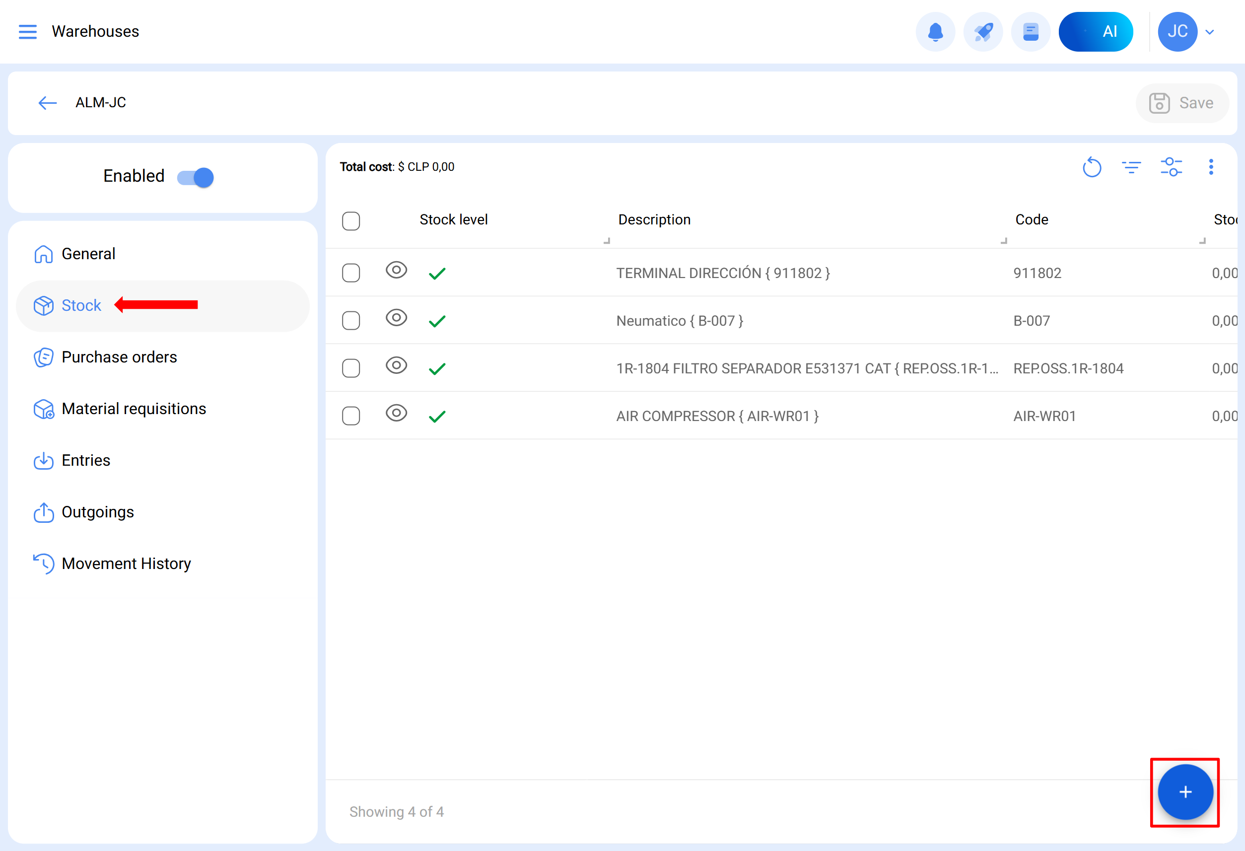 Para adicionar um item diretamente a partir do módulo de armazém, deve-se entrar no separador de stocks e depois clicar no símbolo de adicionar que se encontra na parte inferior direita da plataforma.