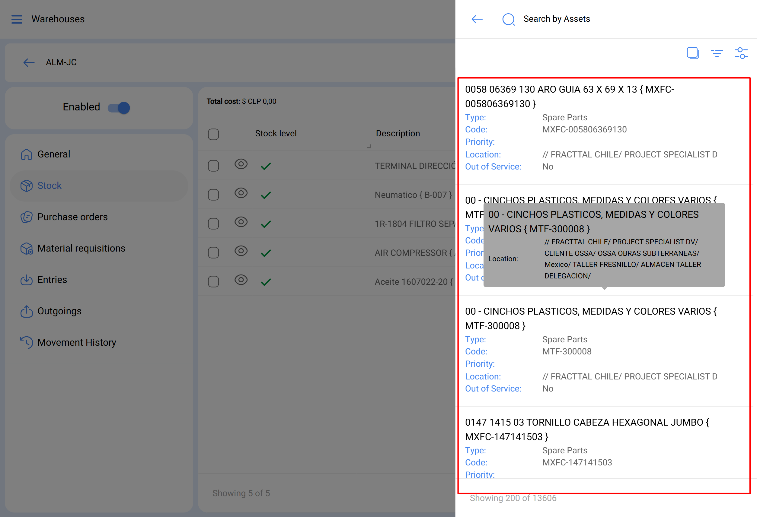 Depois deve clicar no ativo e entrar no separador “Armazéns”, onde aparecerá uma lista com todos os armazéns que contêm esse item entre os seus stocks como recurso.