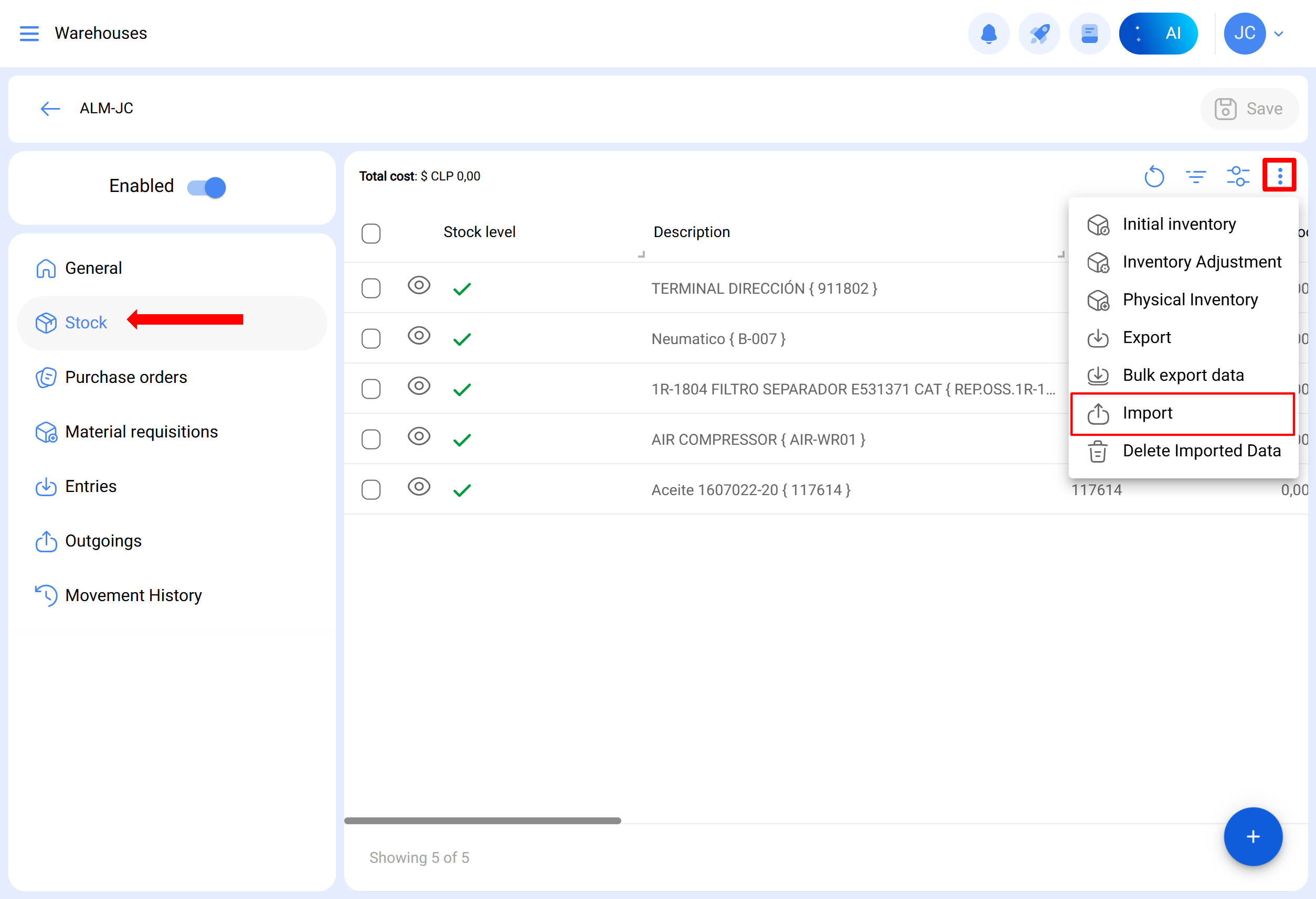 Para isso, basta entrar no separador de stocks e clicar no menu de mais para depois clicar na opção “Importar”.
