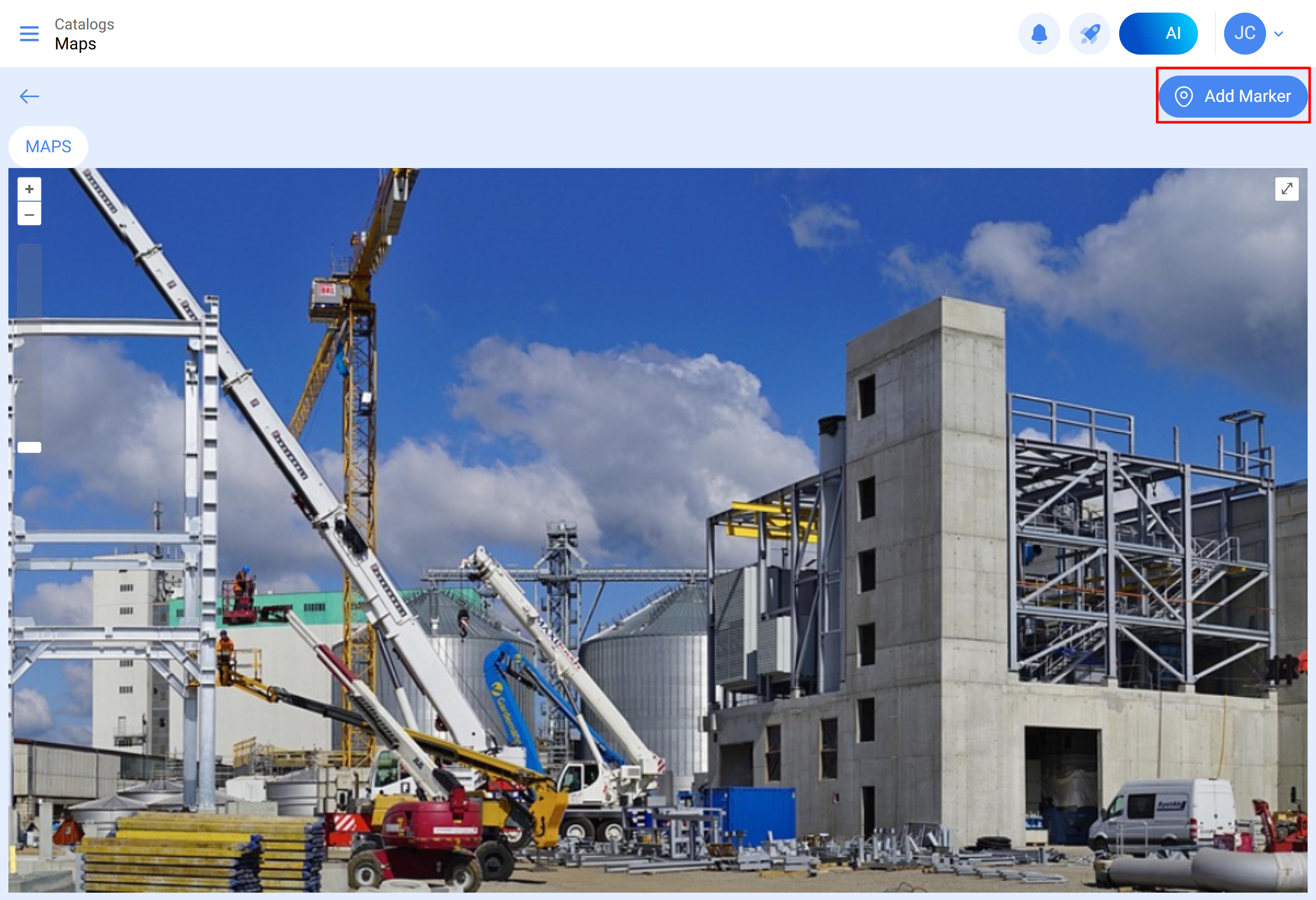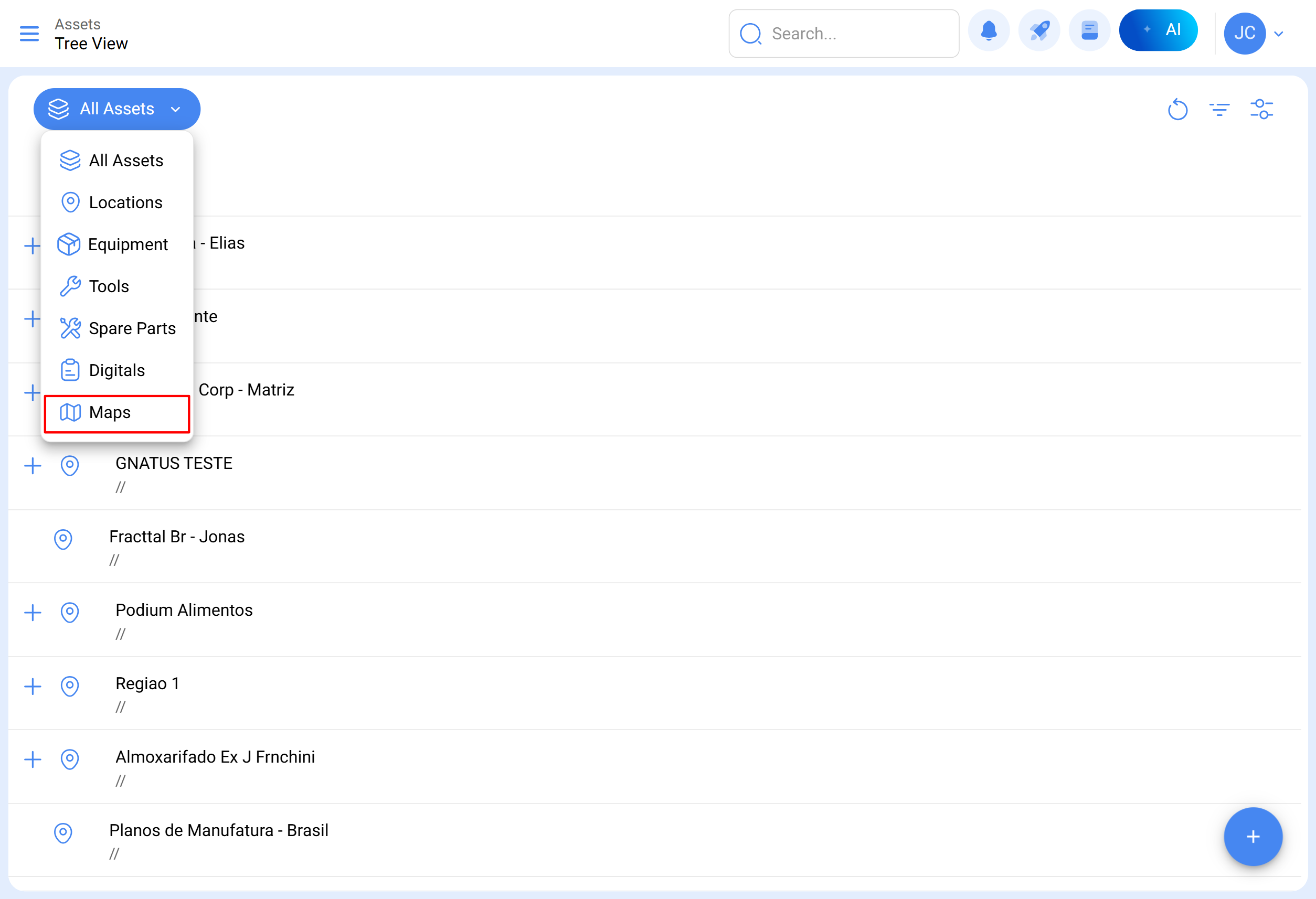Dentro do submódulo de Ativos do catálogo no Fracttal One, a opção Mapas permite a integração visual de ativos em plantas ou layouts preexistentes. Esta funcionalidade tem como objetivo facilitar a localização geográfica ou espacial dos ativos registados, proporcionando uma representação gráfica para a gestão operacional.
