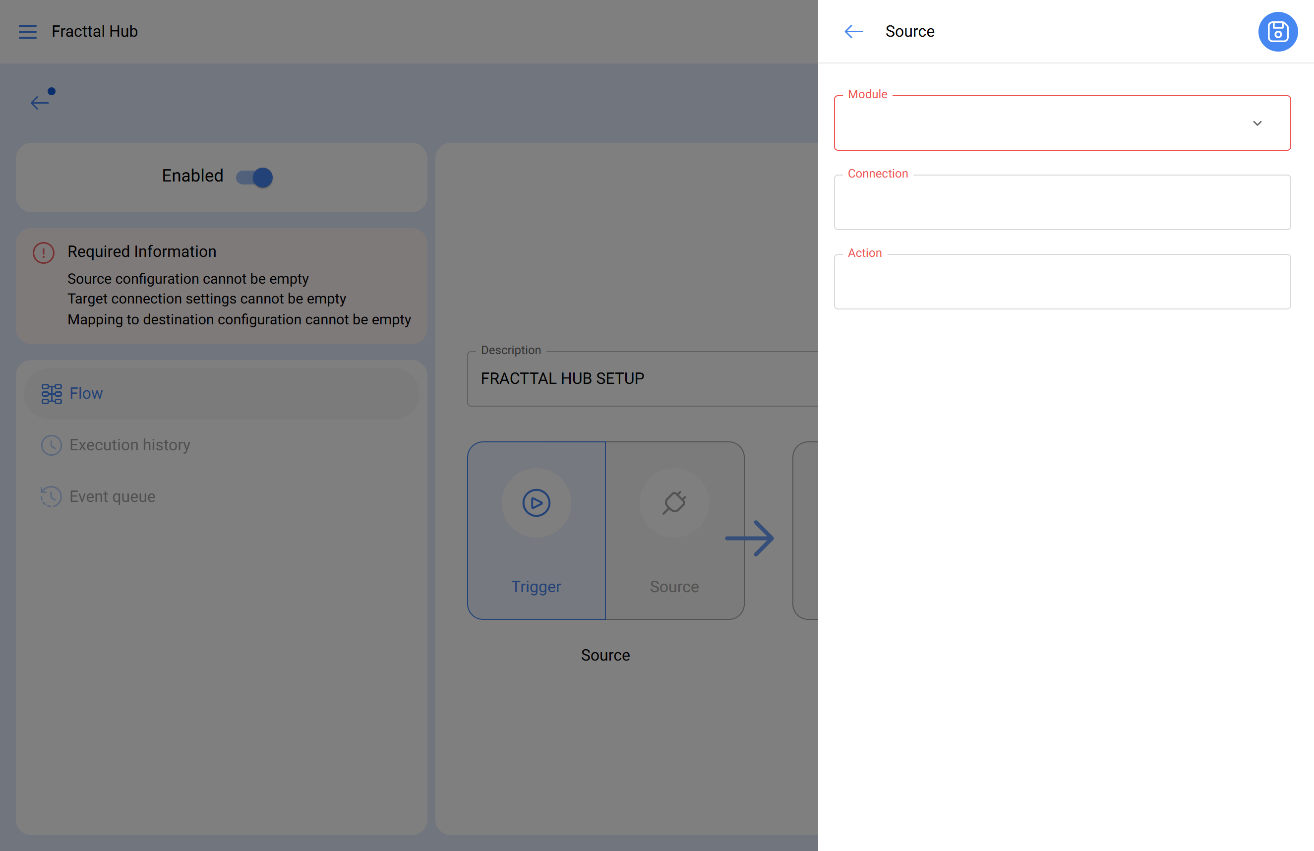 Selecione "Fonte" e especifique o módulo, a conexão e a ação: Em nosso exemplo, trabalharemos com o Google Sheet
