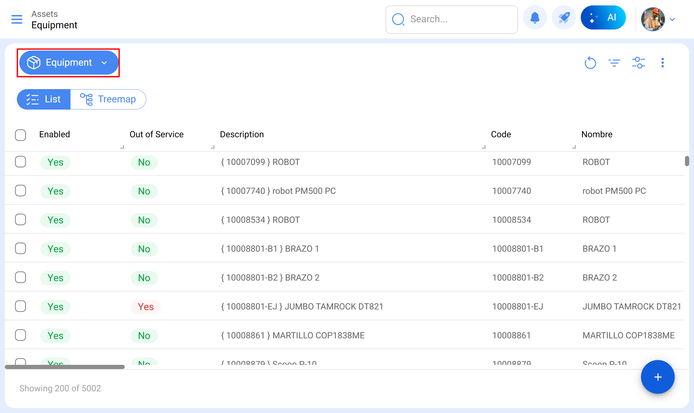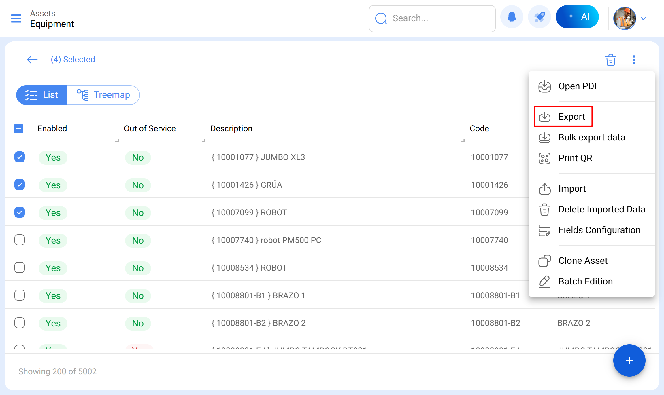 Aceda ao módulo "Catálogos" no Fracttal One e selecione a opção "Equipamentos". Dentro desta secção, encontrará a lista de todos os ativos registados na plataforma. Selecione os ativos cujos códigos QR deseja imprimir.