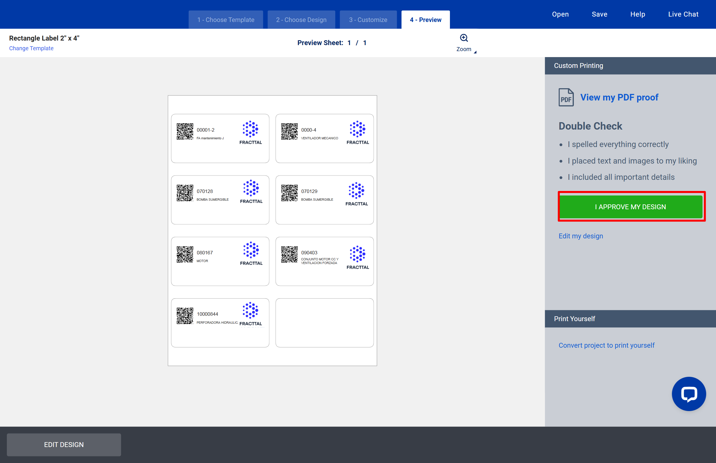 Ao terminar o design das etiquetas, verifique a pré-visualização do resultado final. Se tudo estiver correto, finalize o processo na página de verificação. Se necessário, pode voltar atrás para fazer ajustes ou, caso contrário, aprove o design para proceder à descarga.