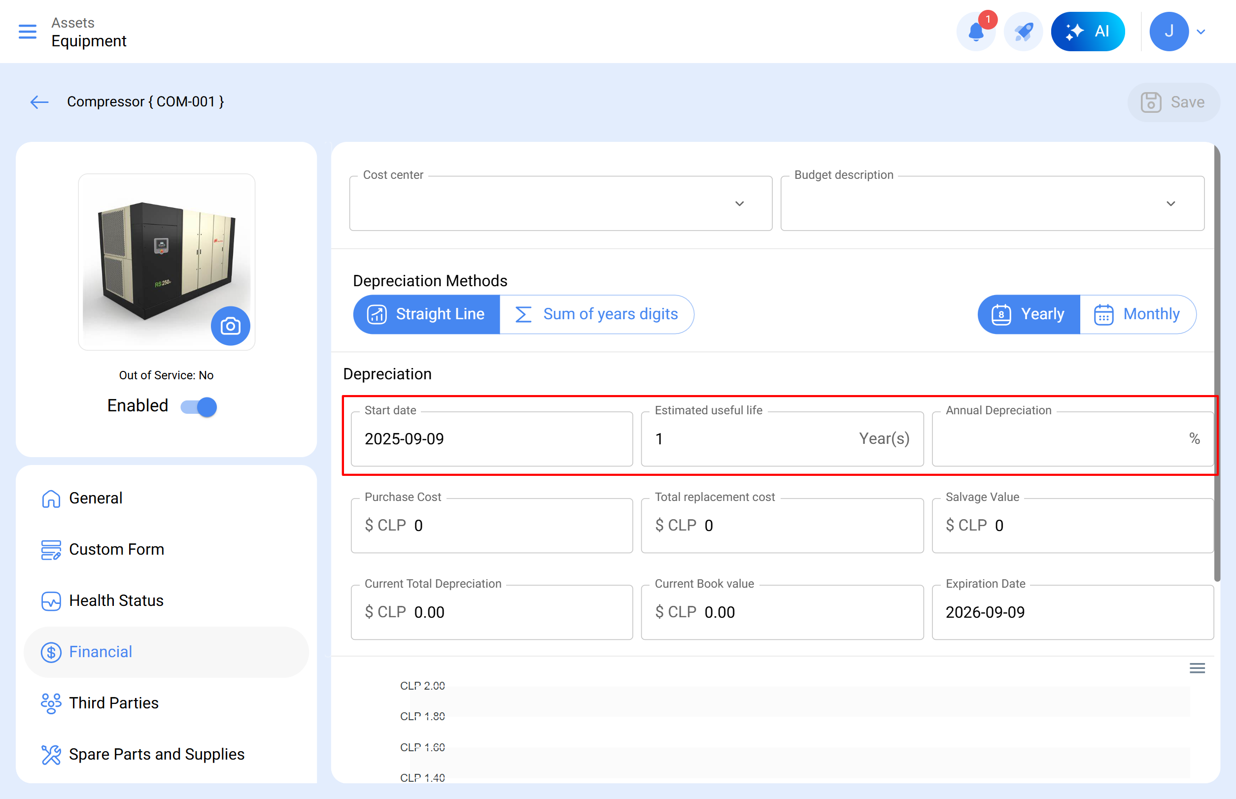 A secção Financeira do módulo de ativos permite definir parâmetros-chave para gerir a vida útil, o valor contabilístico e a depreciação de um ativo ao longo do tempo. Este registo é especialmente útil para controlar o custo total de propriedade (TCO) e tomar decisões estratégicas sobre renovação, manutenção ou baixa do bem.