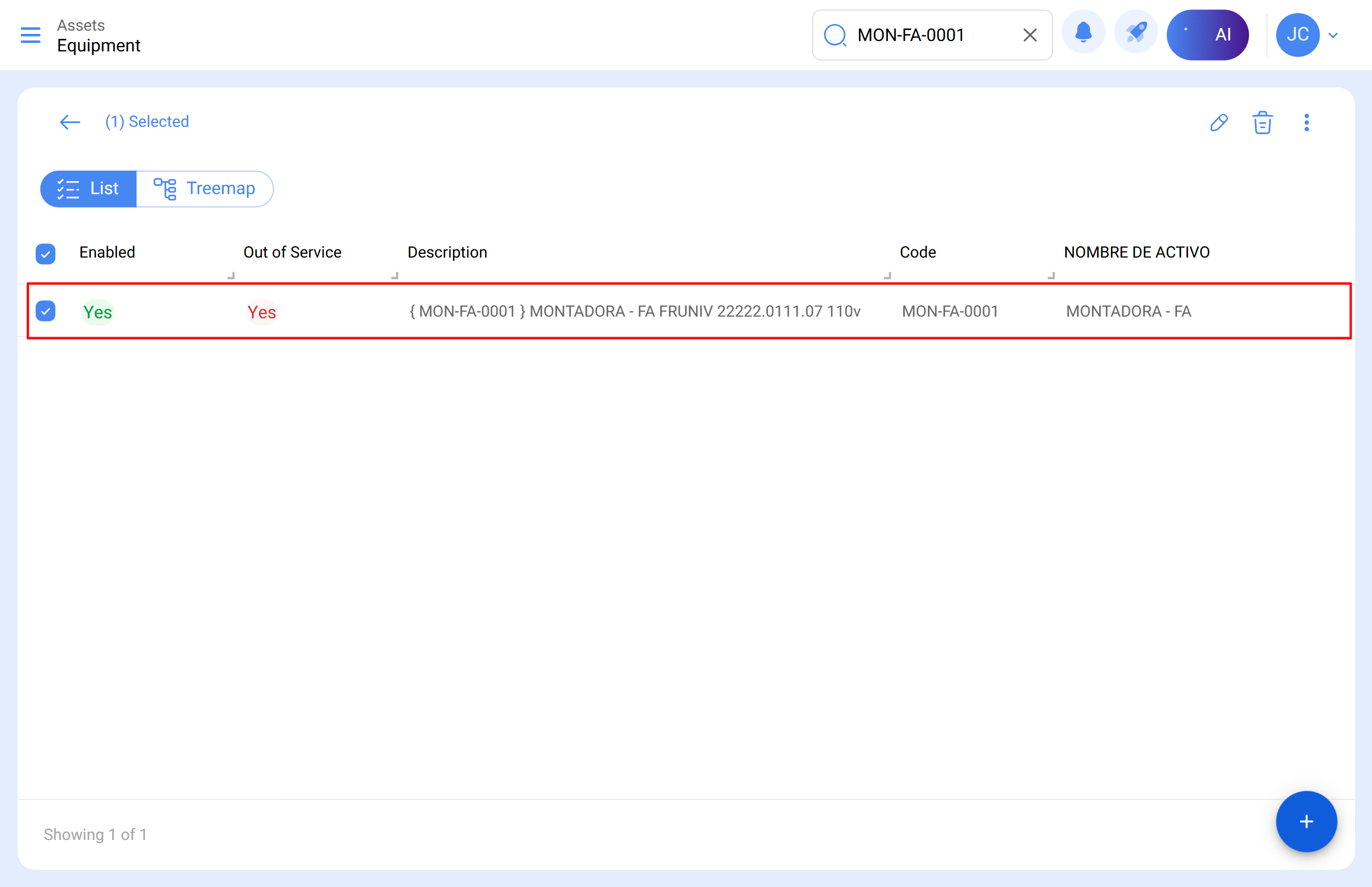 Uma vez dentro do módulo, será mostrada automaticamente a lista completa de ativos. Podes utilizar os filtros ou a barra de pesquisa para localizar o ativo que desejas eliminar.