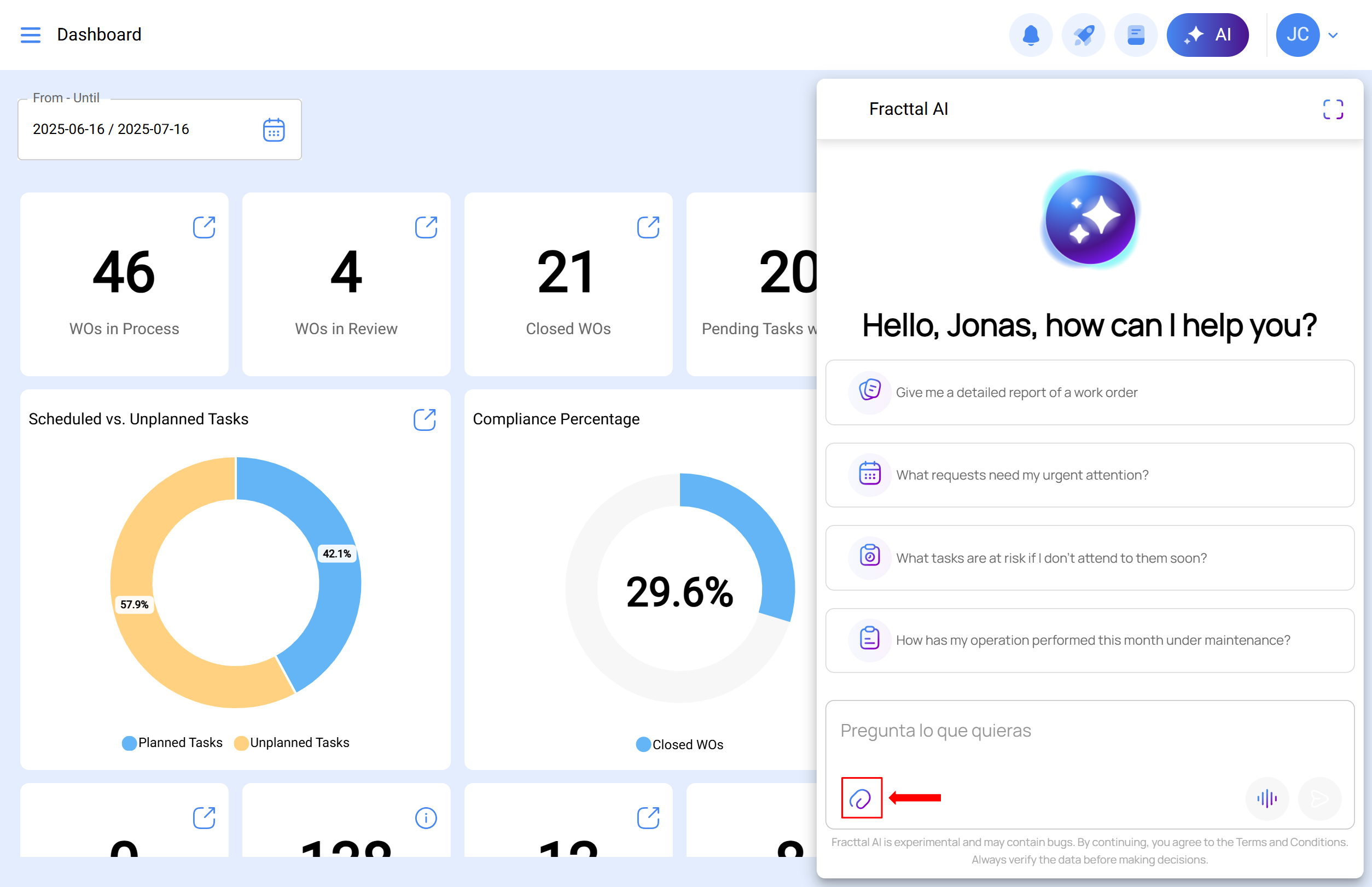No Fracttal One, o assistente de inteligência artificial (AI) localizado na barra superior (toolbar) oferece uma série de funcionalidades desenhadas para facilitar a interação com o sistema e melhorar a experiência do utilizador.