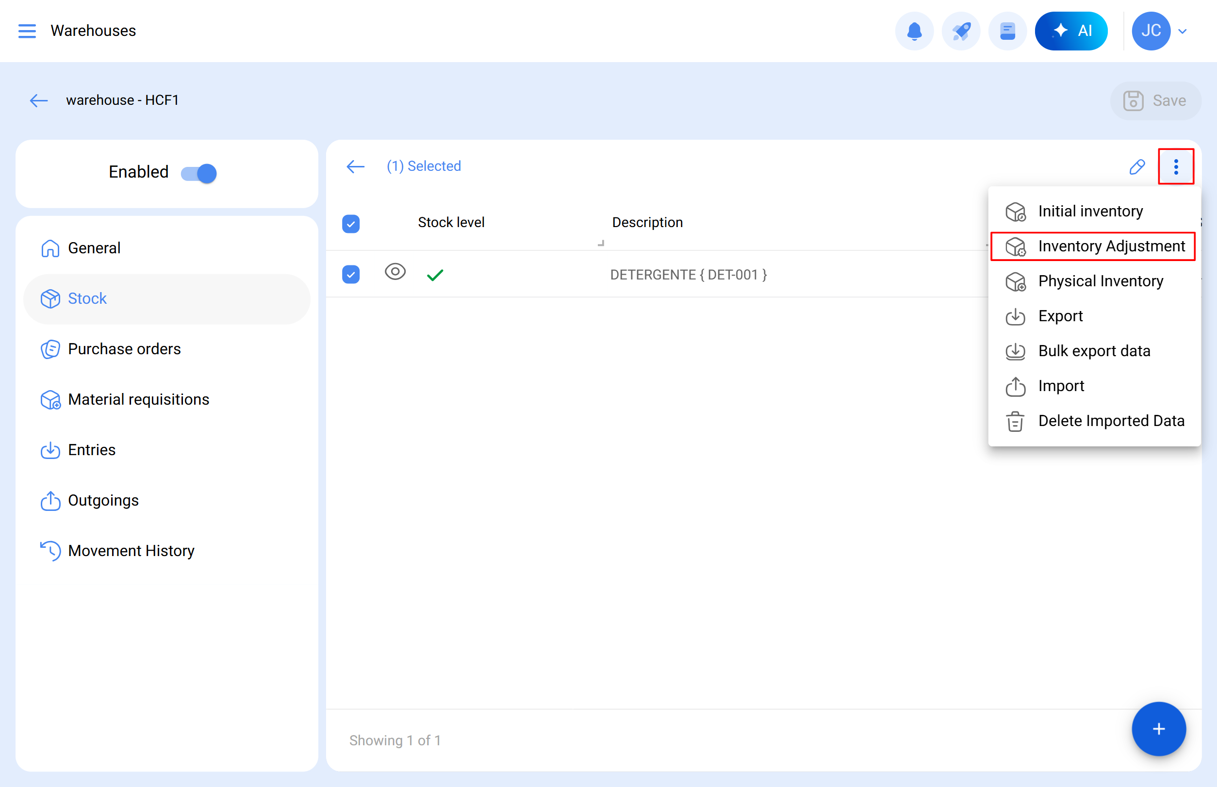 Realize o ajuste de inventário: Com o item selecionado, clique em "Ajuste de inventário" no menu lateral. Esta opção permitirá modificar o stock do item e realizar os ajustes necessários.