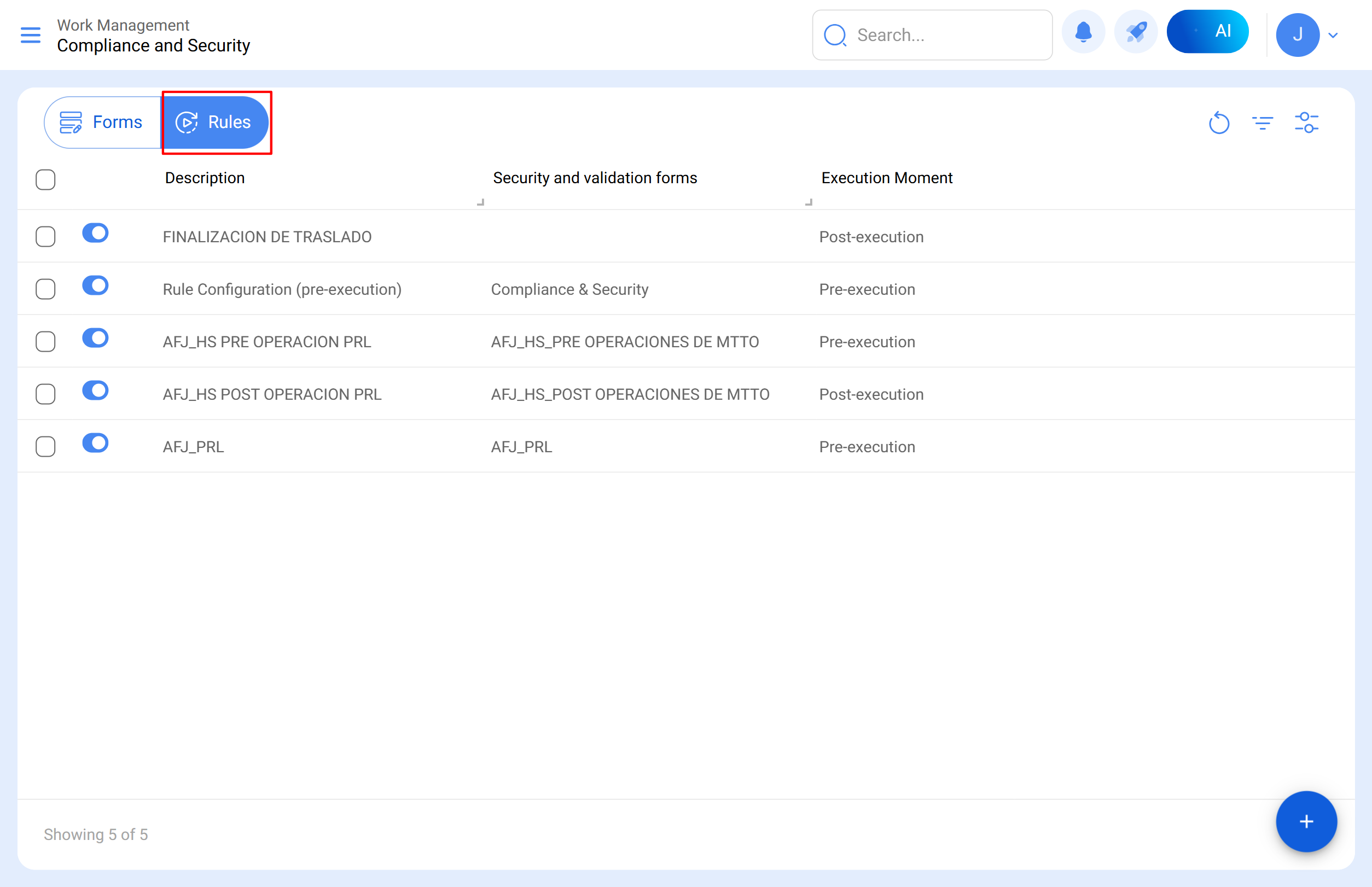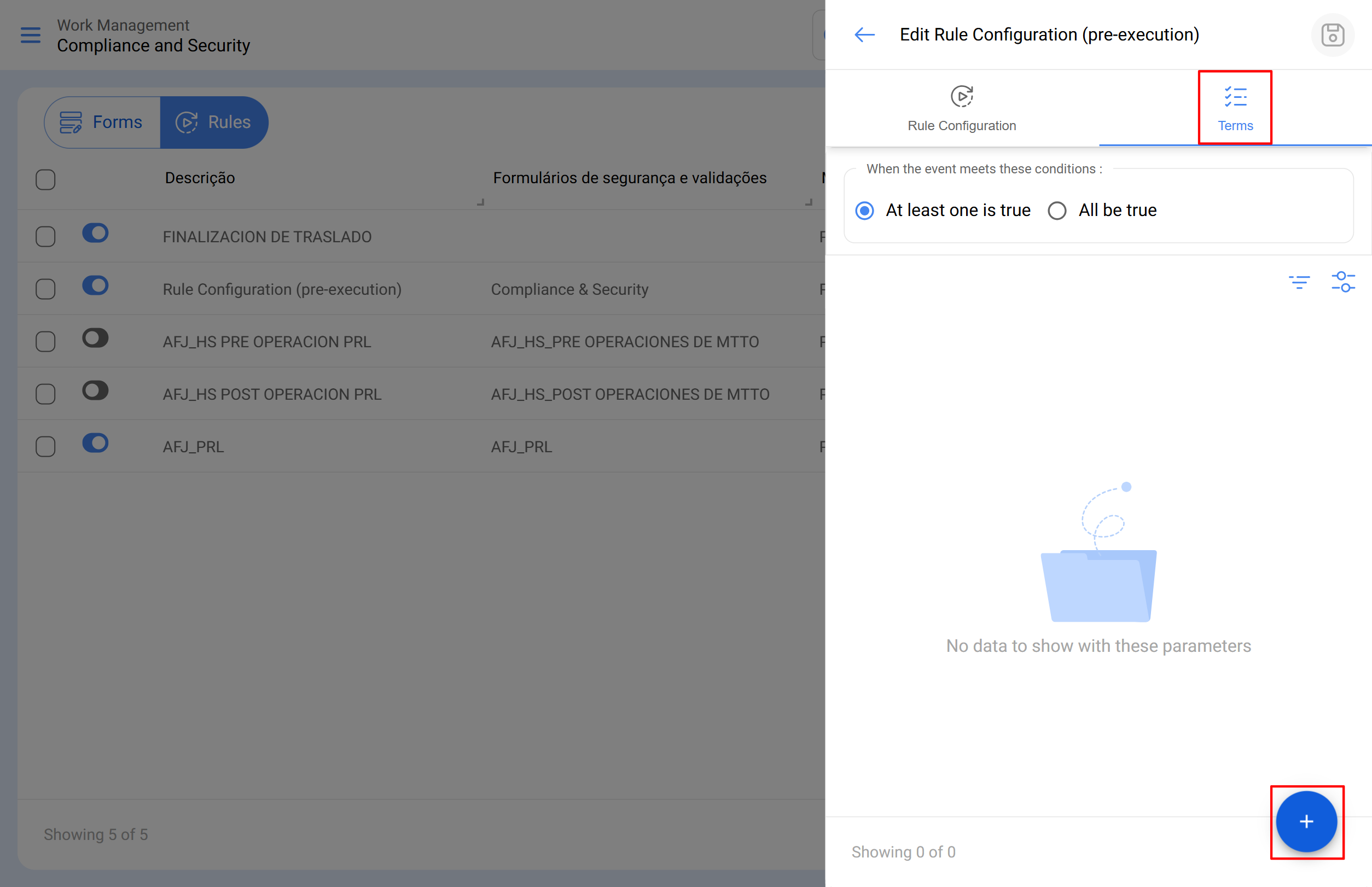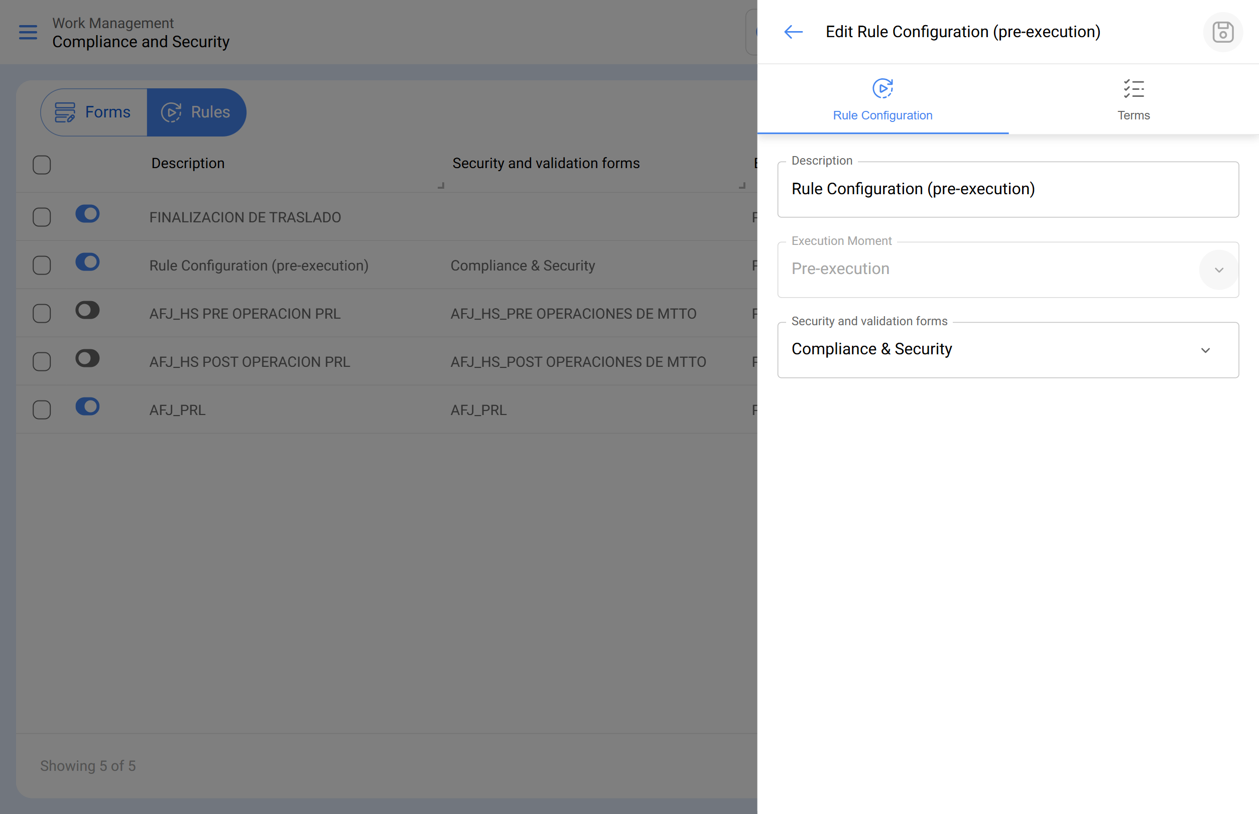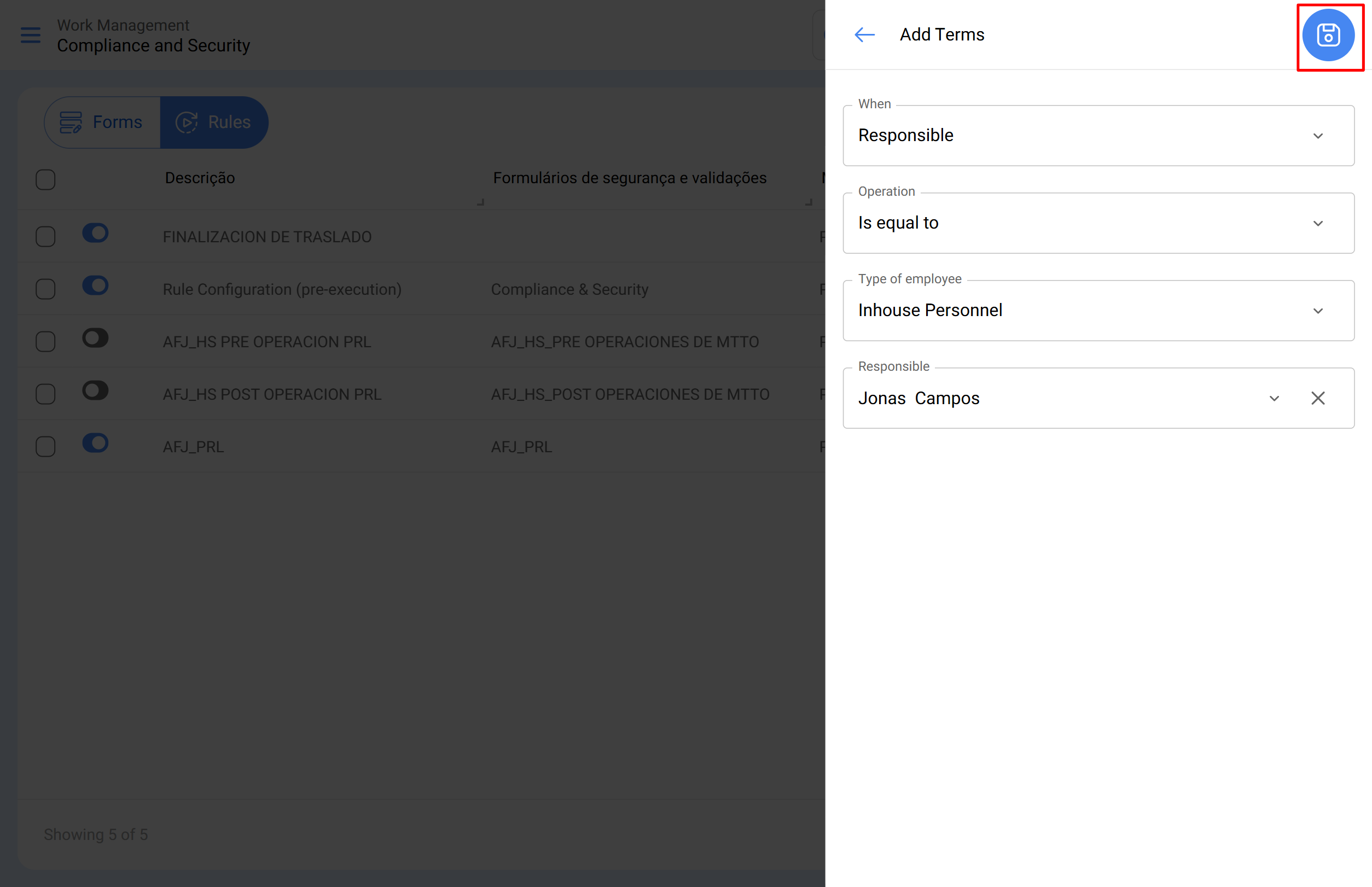 Esta configuração assegura que os formulários de Compliance e Segurança se ativem de forma controlada, sob critérios previamente definidos, permitindo um controlo mais rigoroso das tarefas e processos operacionais.