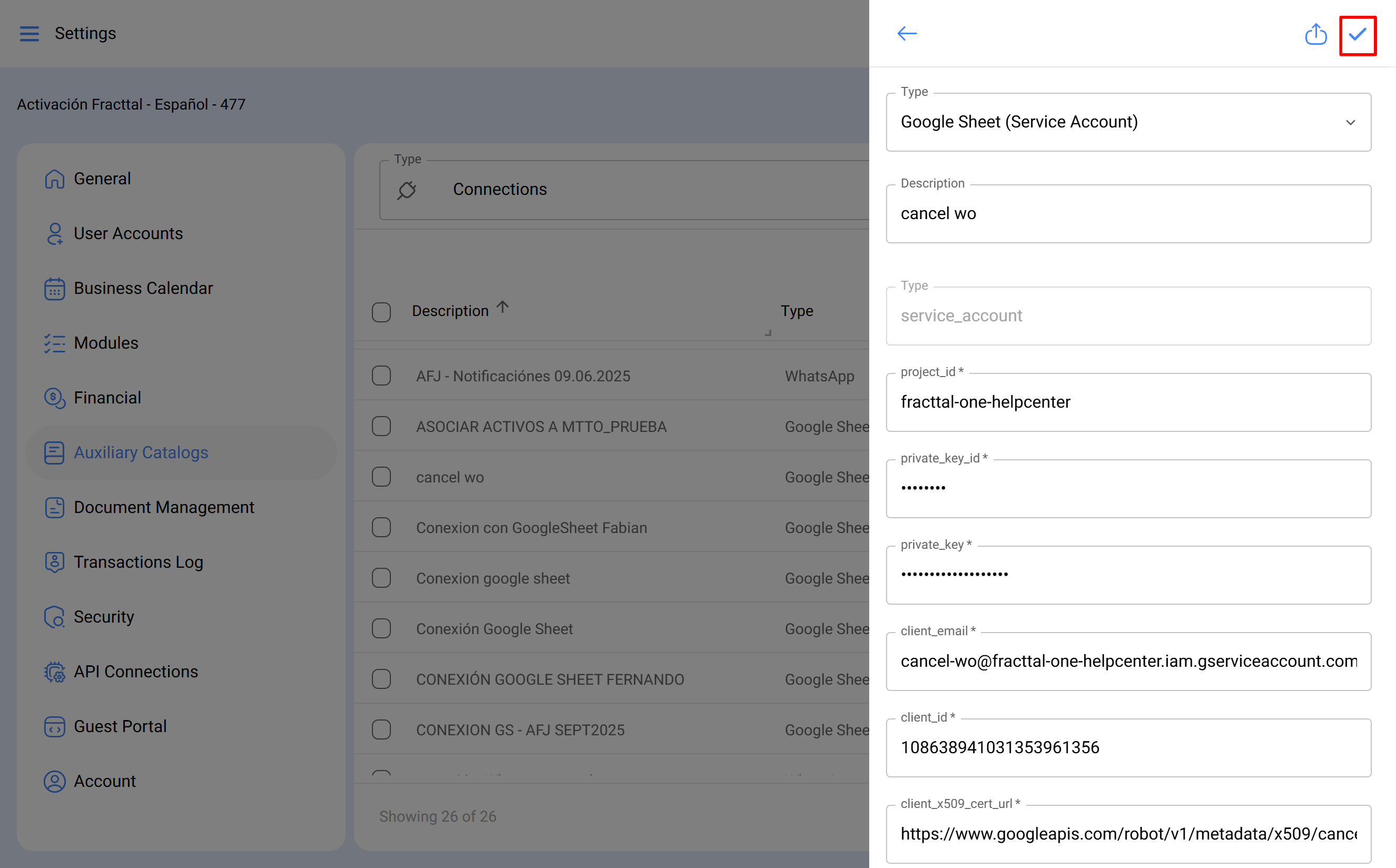 A conta de serviço irá atuar como um “utilizador robô” que o Fracttal utilizará para aceder de forma segura à sua folha de cálculo.