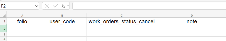 Preencha as colunas user_code, work_orders_status_cancel e note para todas as linhas correspondentes. Pode arrastar os valores caso sejam iguais para todas as OTs.