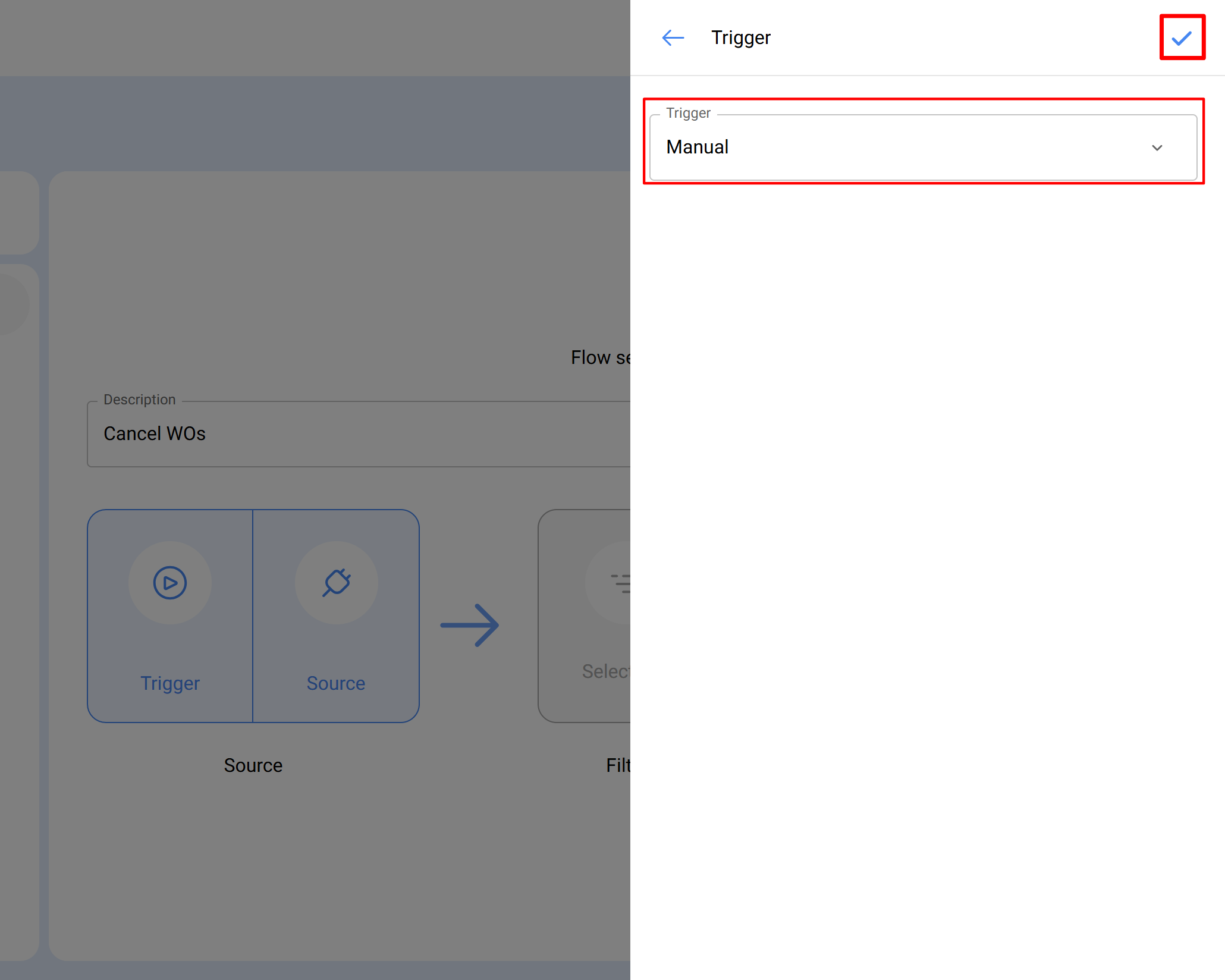 - Em Ação, procure e selecione cancel_work_orders_bulk.