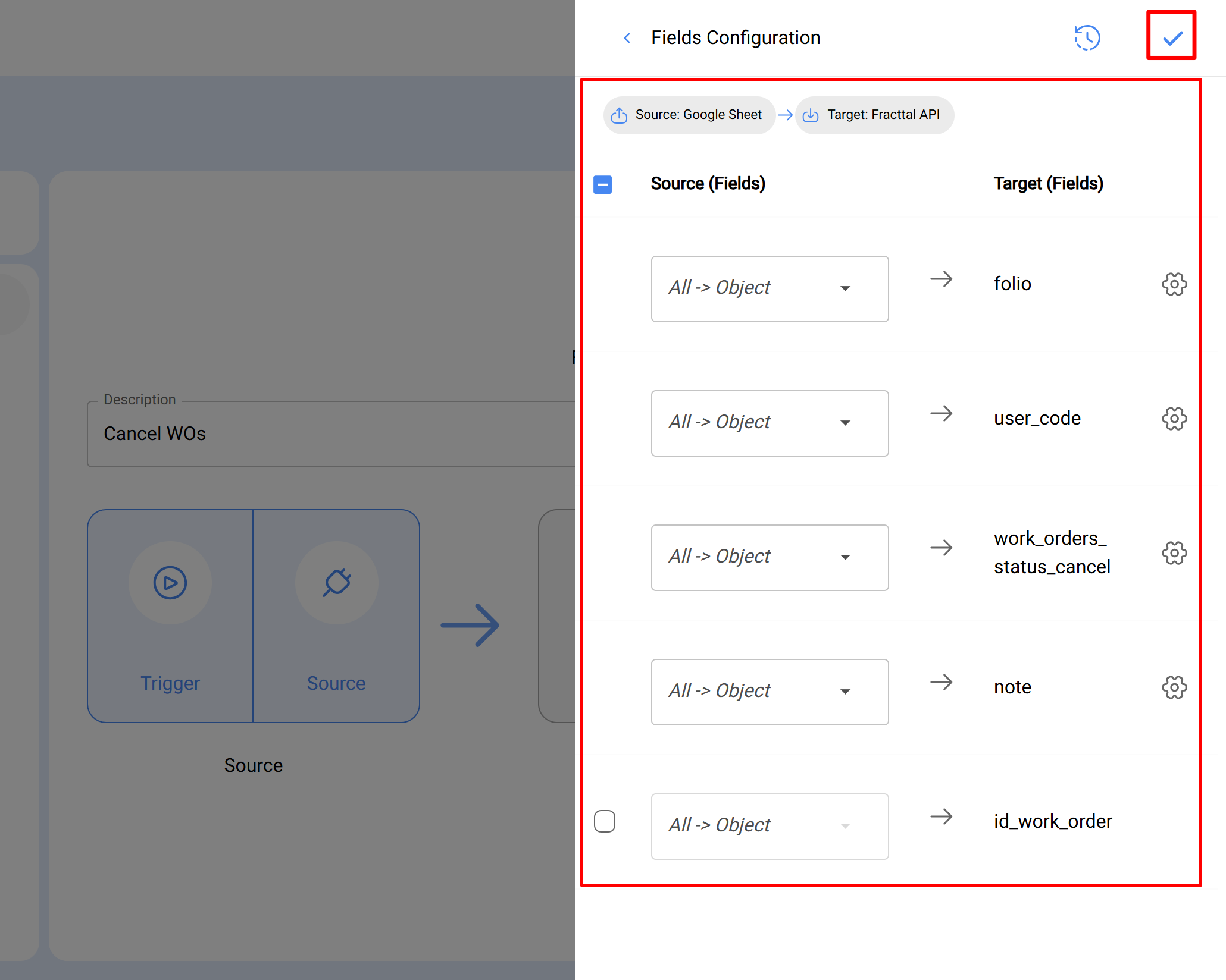 - Será aberta a página de Configuração de Campos. Aqui deve ligar os dados da Fonte (Google Sheets) aos campos esperados pelo Destino (Fracttal). Faça o mapeamento da seguinte forma: