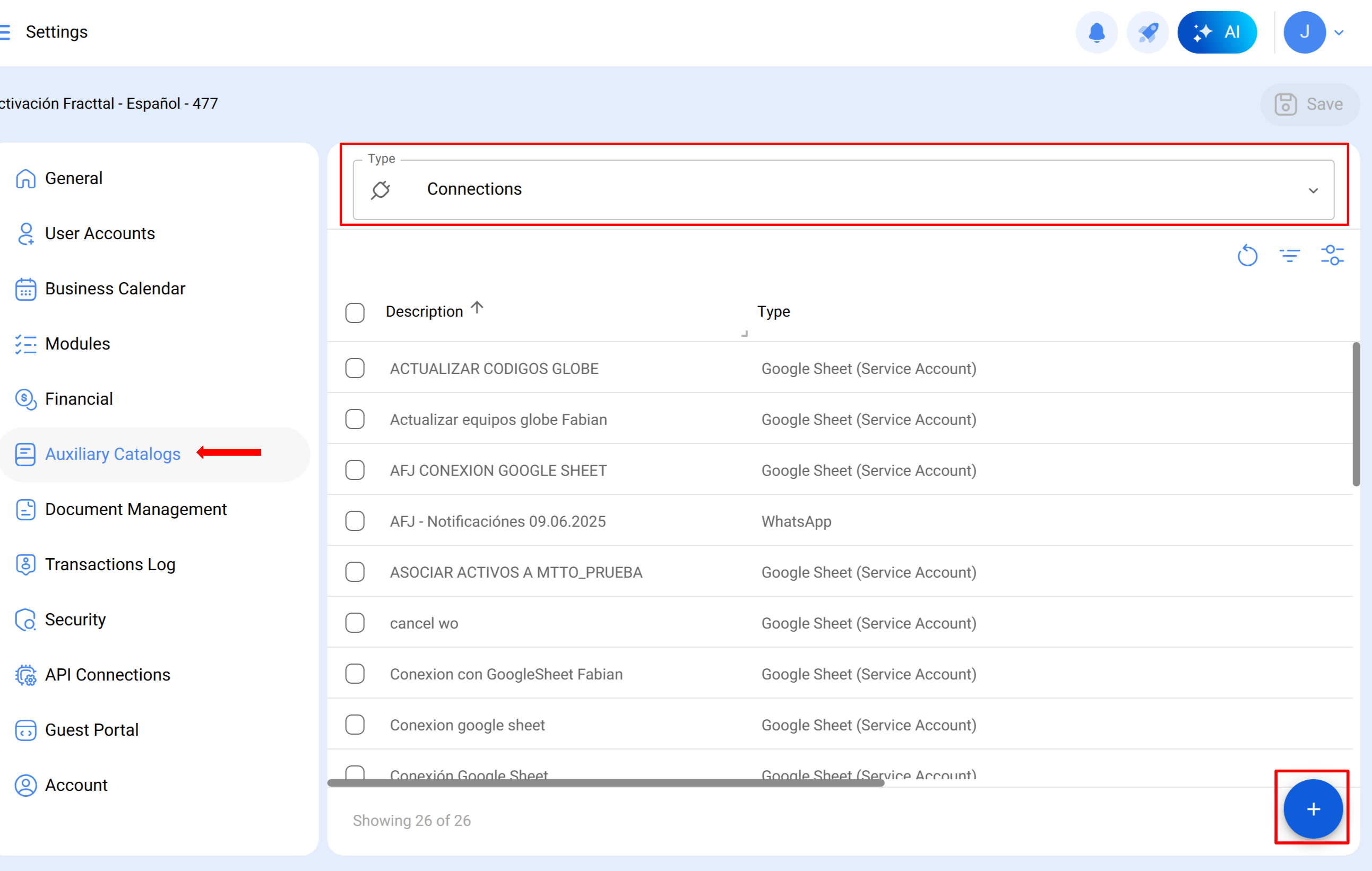 Na sua instância do Fracttal One, aceda a Configurações ▸ Catálogos Auxiliares ▸ Ligações e clique em ( + ) para adicionar uma nova ligação.