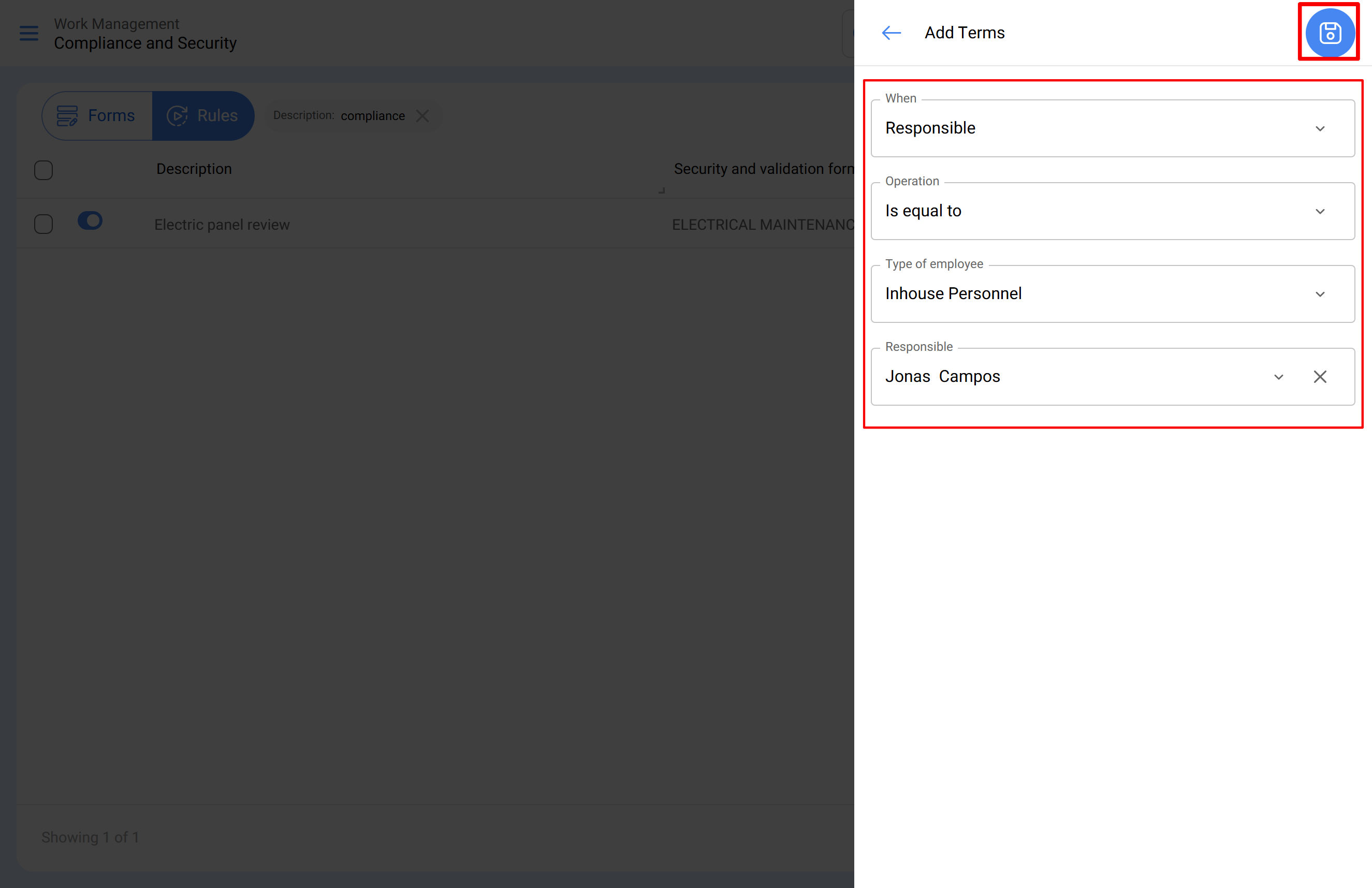 Dentro do submódulo Compliance e Segurança, a secção "Regras" permite definir condições específicas para determinar quando um formulário deve ser exibido durante a execução de uma tarefa. Assim, o sistema solicita validações apenas quando necessárias, garantindo a conformidade com os procedimentos internos de segurança e qualidade.