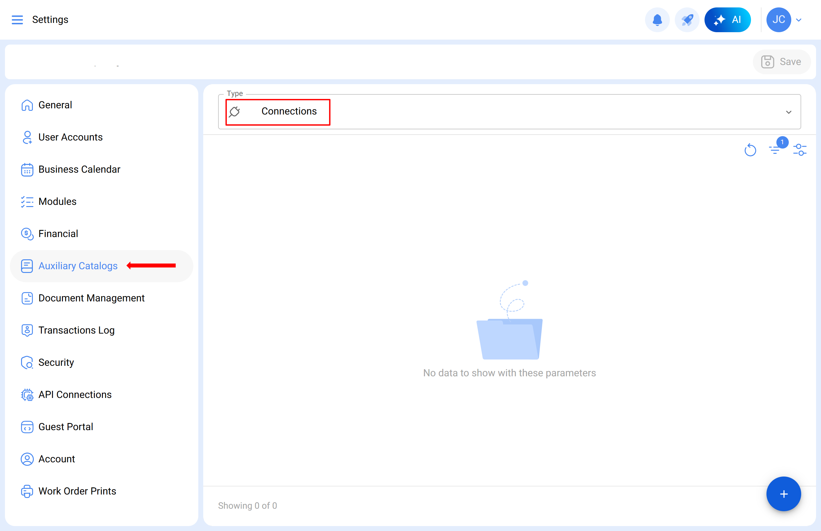 Configuração → Catálogos Auxiliares → Tipo: Ligações