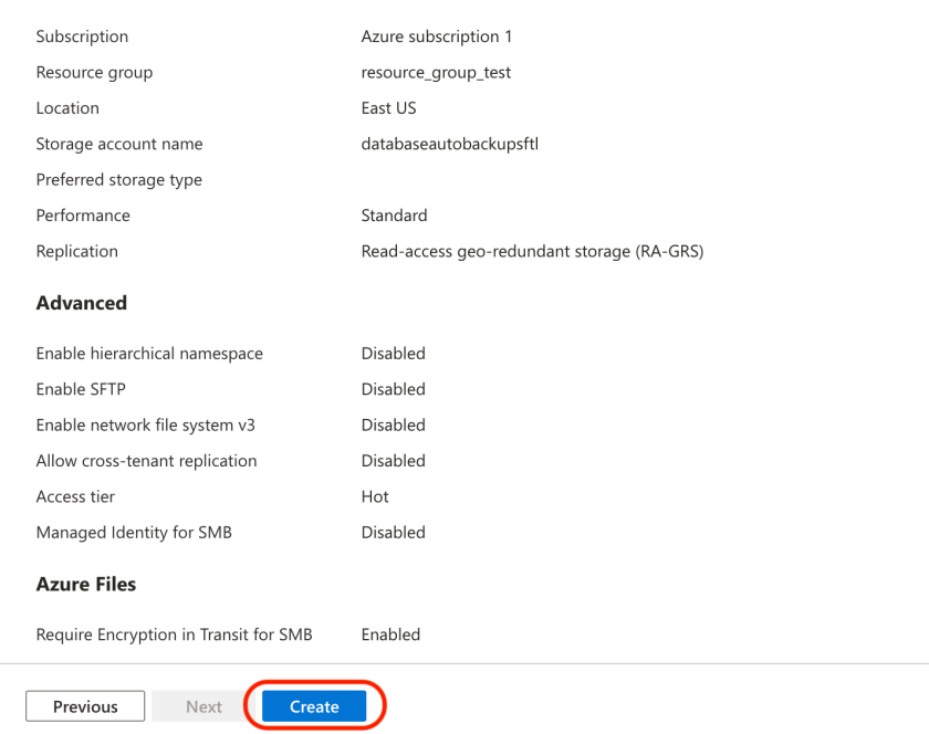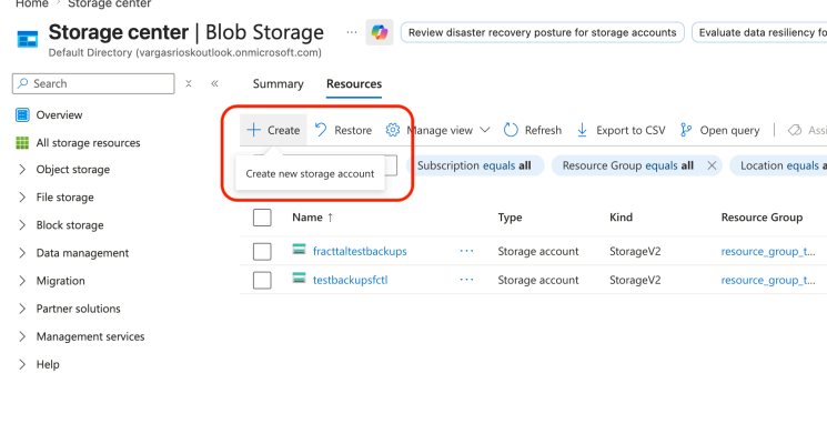 Clique em Criar para iniciar a criação de uma nova conta de armazenamento.